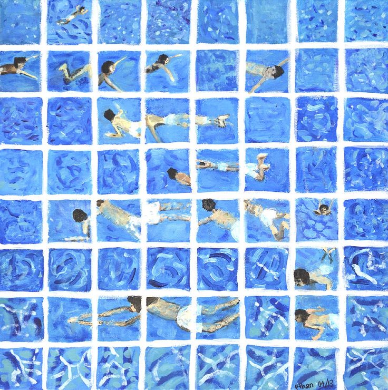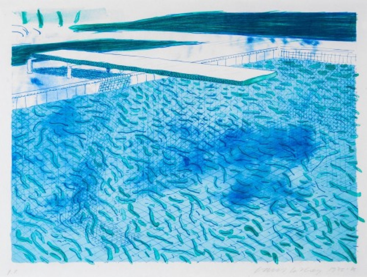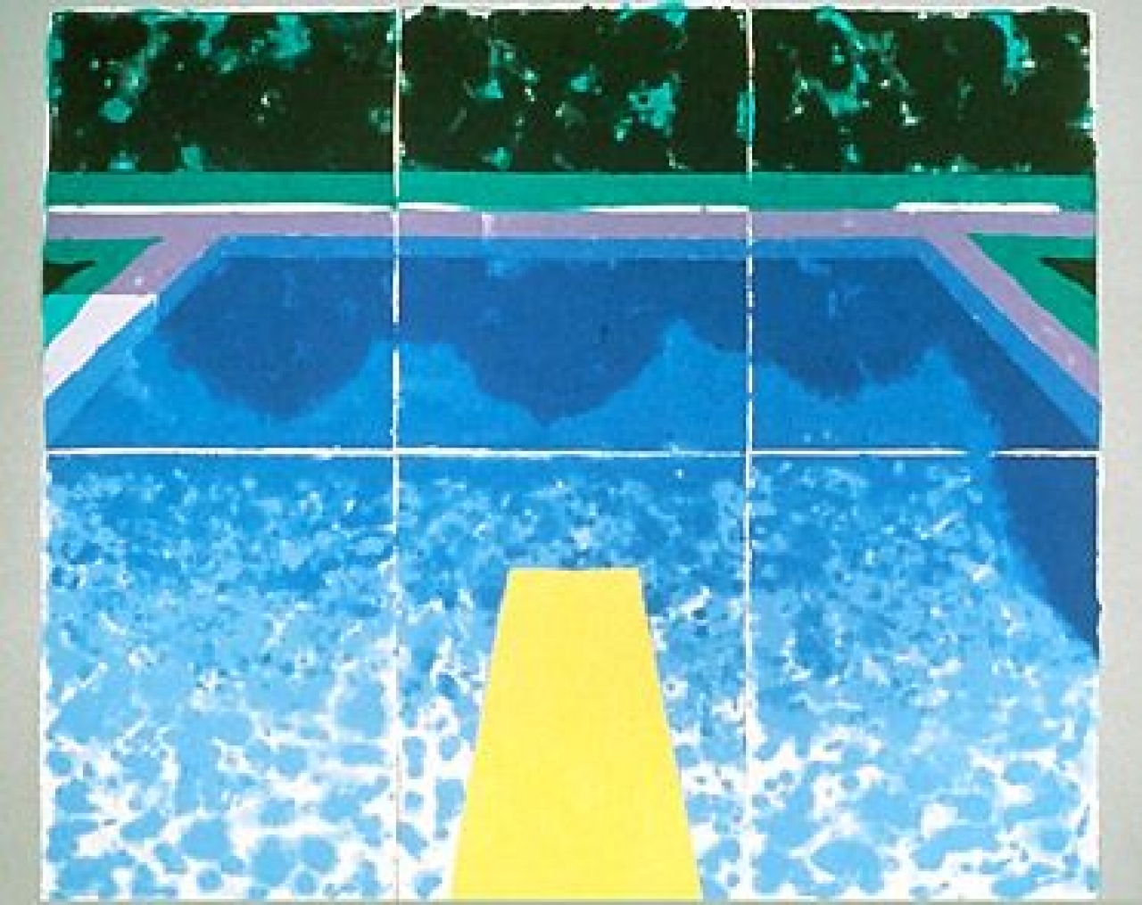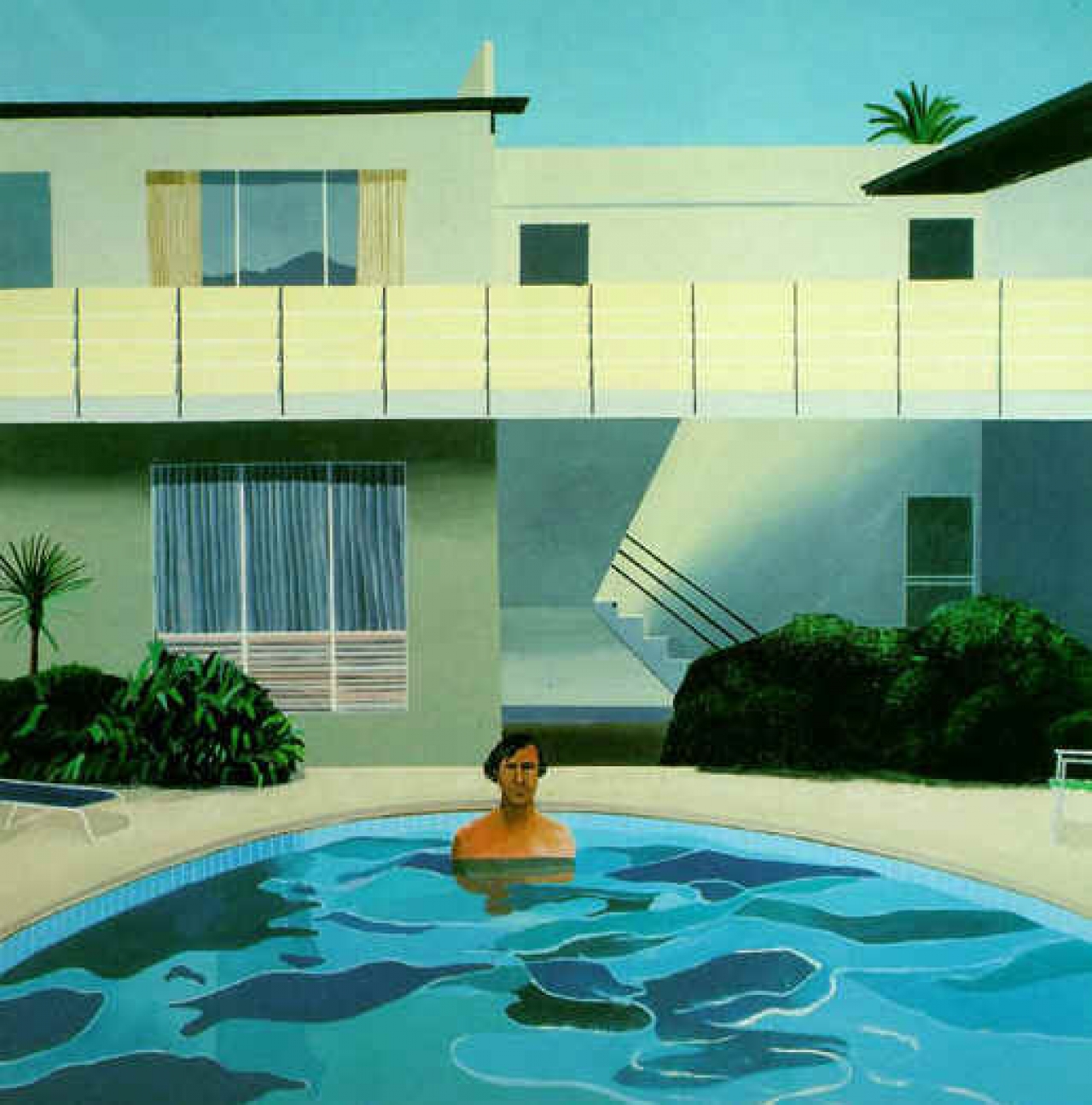 Hij is de meester van het zwembadschilderij: David Hockney. De oorspronkelijk uit Yorkshire komende kunstenaar vertrok in 1963 voor het eerst naar Los Angeles. Een land dat hij enkel kende van films. ‘In Yorkshire was alles zo grijs, geen wonder dat ik pas in Amerika de kleuren ontdekte’, vertelde hij jaren na zijn vertrek in een interview. ’toen we over Los Angeles vlogen en ik vanuit het vliegtuigraampje naar beneden keek, zag ik overal blauwe vlakken die de grond bedekten. Niet veel later realiseerde ik me dat het zwembaden waren, een ‘product’ dat in mijn regenachtige thuisland Engeland een luxe was, terwijl ze in het zonovergoten Californië op het groene gazon naast ieder minimalistisch wit huis, ondenkbaar zijn.’