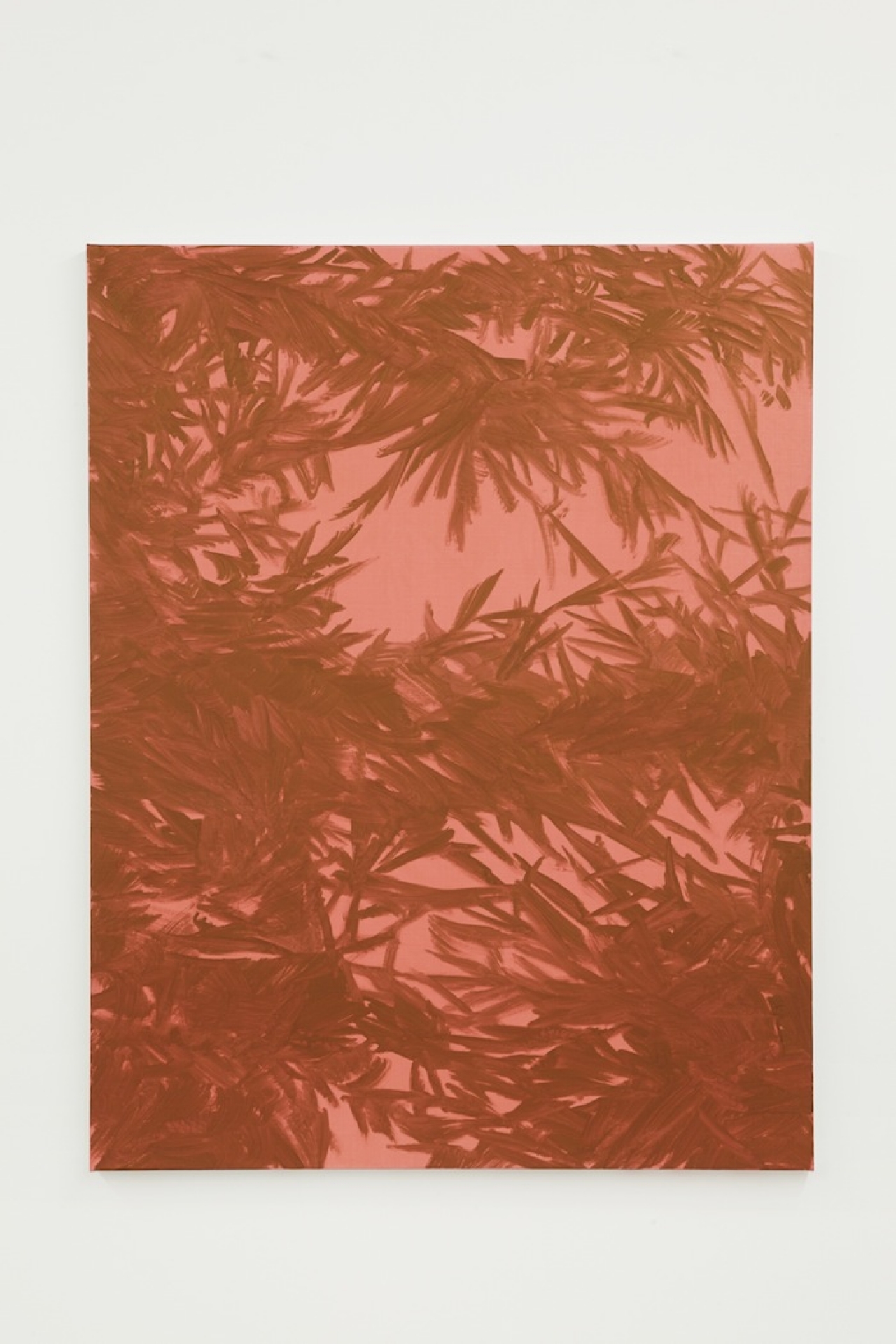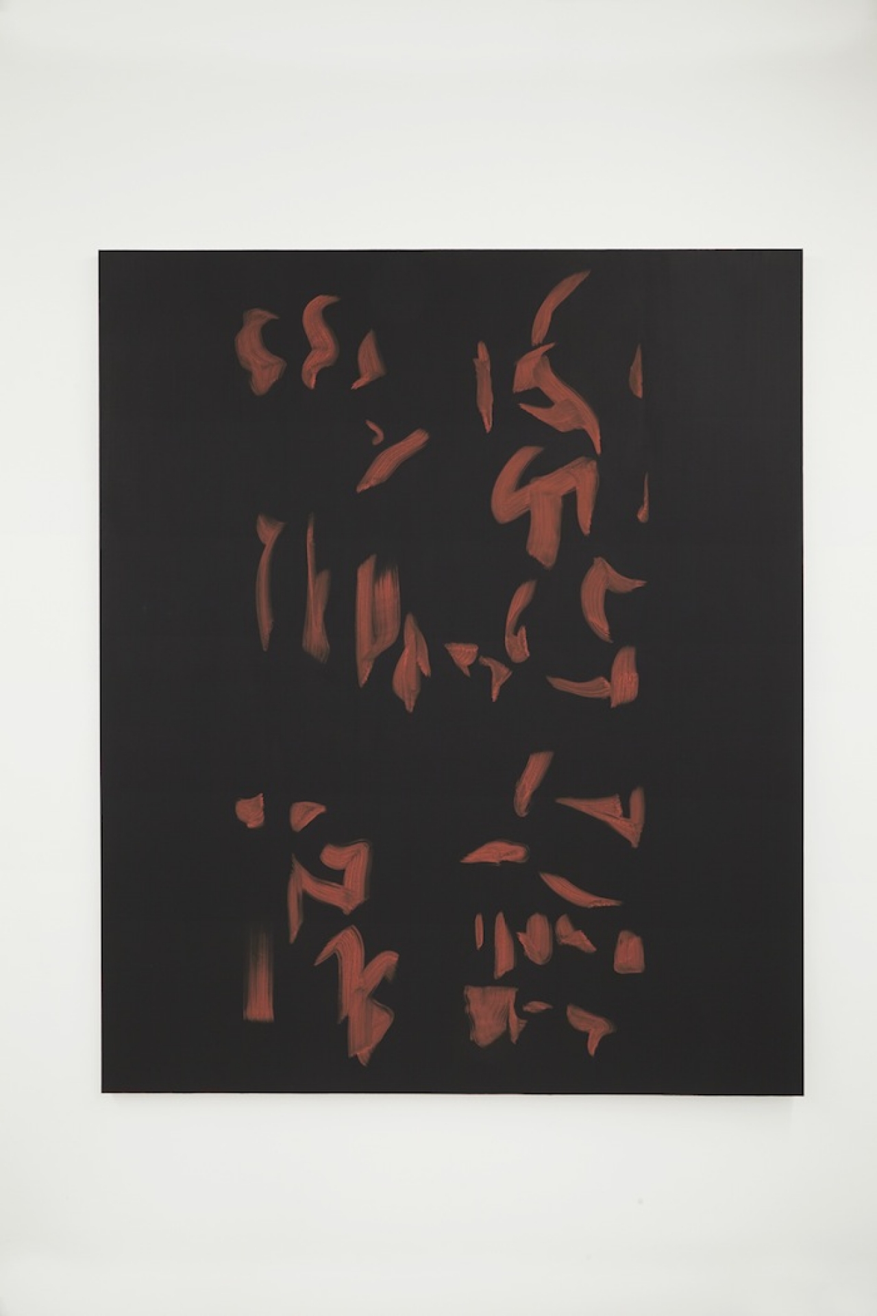 Ik keek de kamer van mijn buurman binnen tijdens de schemering. Als de zon door dat oude glas heen schijnt komen er vlekken op de rode muur van deze kamer. Het ginkgoblad aan de boom zorgde voor zwarte vlekken. Met de foto als basis werk ik steeds verder en verder. Een voorstelling van rood op zwart. Ik wilde dat het rood licht gaf, feller zou zijn. Vier maal heb ik het geschilderd voor het goed werd. In het maken kristalliseren de vormen zich uit, ze worden steeds zelfstandiger als tekens en tussenruimten. Een foto van de reflectie van de ginkgoboom was uitgangspunt, het is geen vertaling van wat ik zag, maar alle gedachten er uit weggelaten.