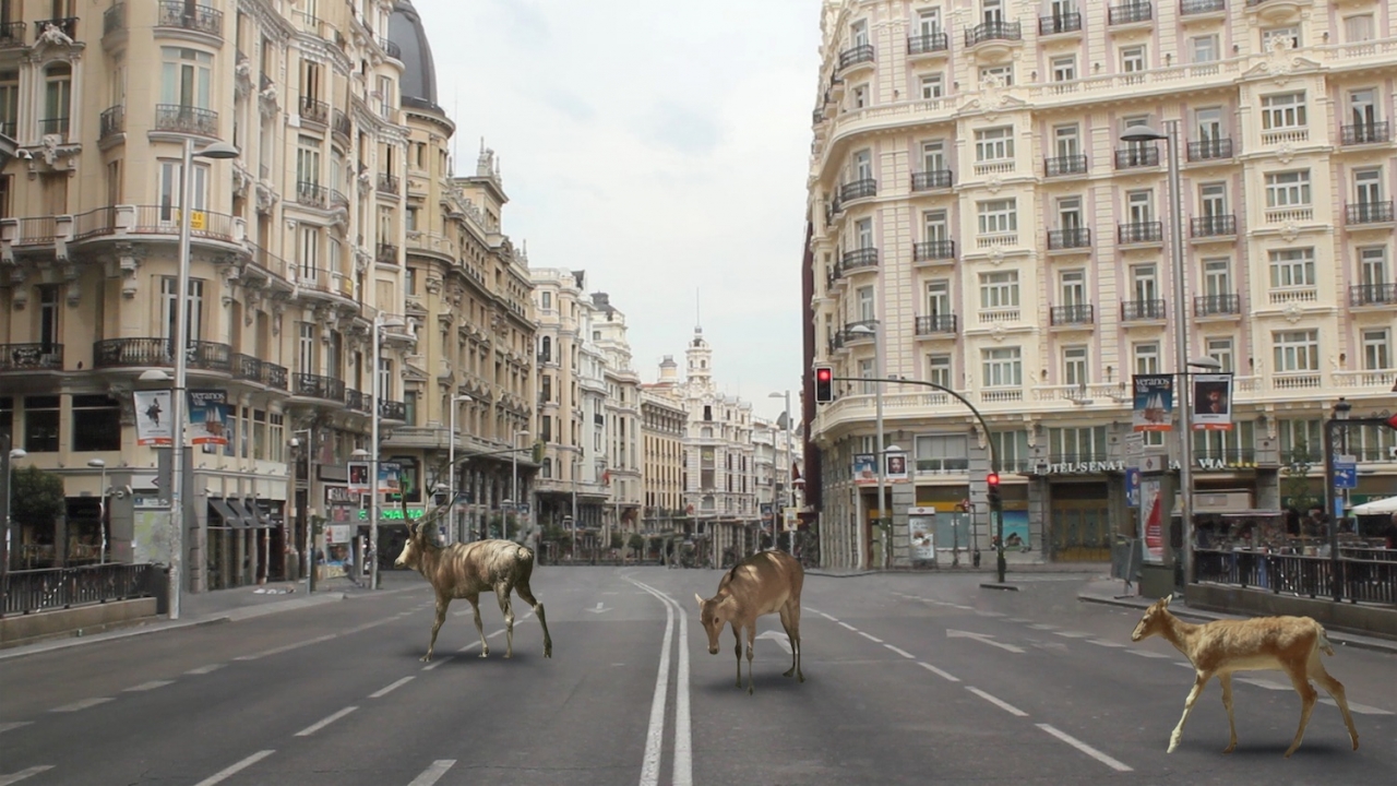 Deze vraag speelt ook een rol in het werk van Albert Merino met wie ik in een diepgaand gesprek beland via messenger. Hij onderzoekt de grens tussen menselijkheid en dierlijkheid. In 2015 maakte hij het videowerk Bestiari, waarin kuddedieren de compleet lege straten van Madrid als decor voor hun habitat innemen. ‘Dit werk geeft me echt kippenvel als ik het nu terugzie.’ zegt Merino. ‘Ik had nooit gedacht dat dit een mogelijke voorbode zou kunnen worden van een werkelijke situatie. Ik zag gisteren nog beelden circuleren op internet van dieren die verlaten plekken in de leeggelopen steden bewonen.’