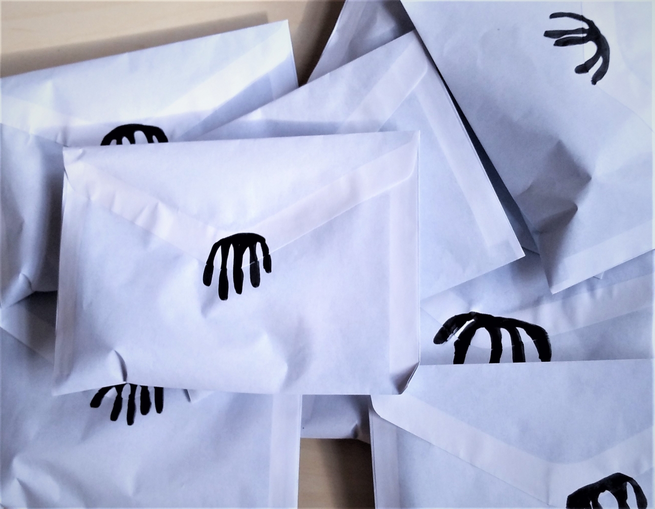 Eerder in het jaar had ik een hele toffe glasblazerscursus in Zweden gedaan en daar had ik hele mooie sculpturen gemaakt. Voordat die mijn kant op konden komen ging de quarantaine in. Geïnspireerd op het werk wat ik Zweden gemaakt heb, ben ik toen hier met een lijmpistool aan de slag gegaan om kleine handjes te maken. Deze zelfgemaakte handjes stuurde ik in een brief naar verschillende mensen toe die daar dan vaak weer op reageerden met hun eigen angsten. Deze angstuitwisseling heb ik uiteindelijk per persoon vormgegeven in leporello’s.