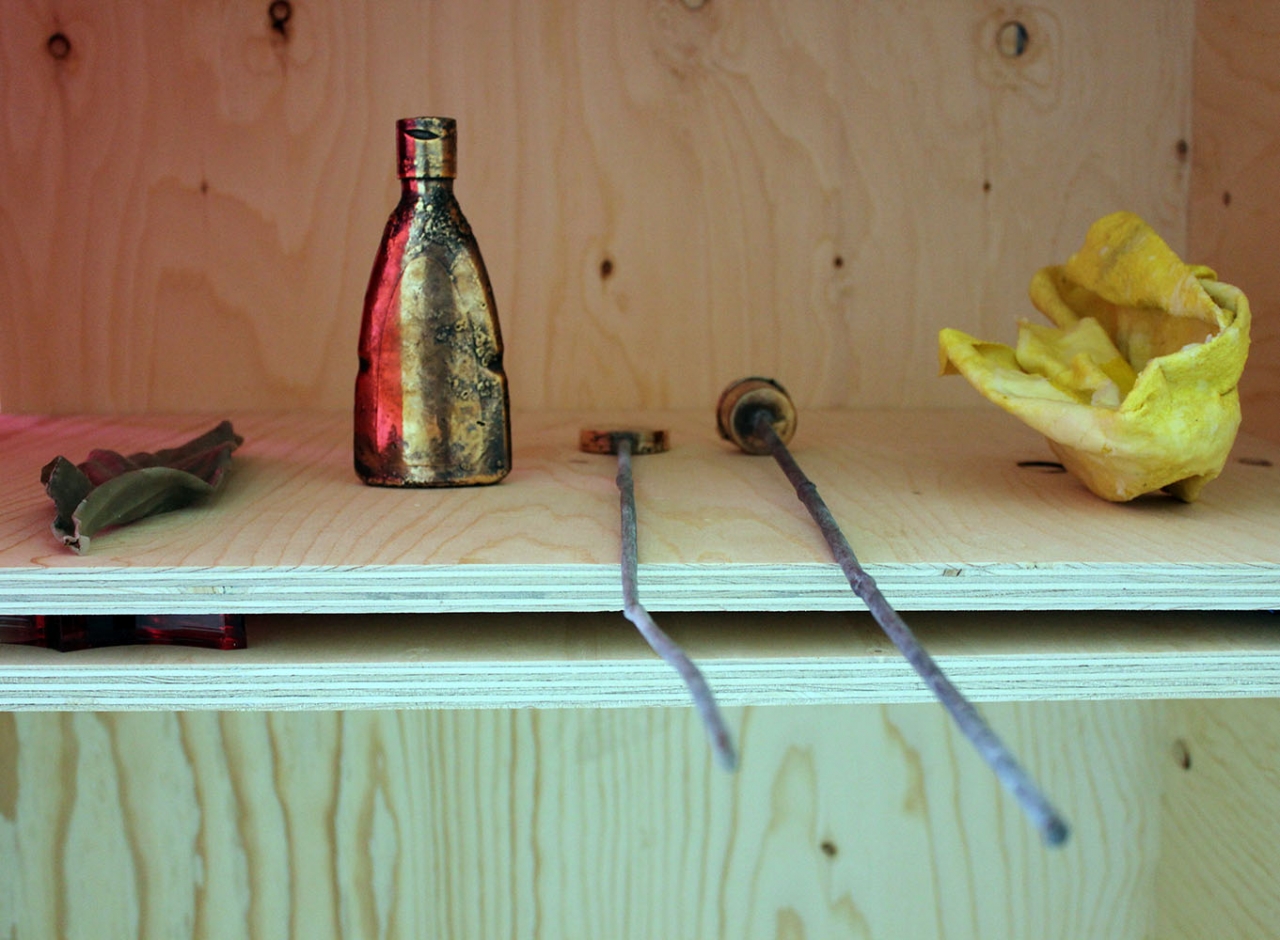 Een installatie van tegen elkaar leunende schilderijen, een bronzen beeld dat evengoed een goud gespoten homp plastic zou kunnen zijn en een stoel met gesprongen veren. De willekeurige plaatsing van de objecten staat in schril contrast met de strenge depotprocedures waarbinnen ze zich normaliter bevinden. Door niet te benoemen door wie het is gemaakt of wanneer lijkt Van Imhoff ons kale systeem van objectieve archivering aan de kaak te stellen.