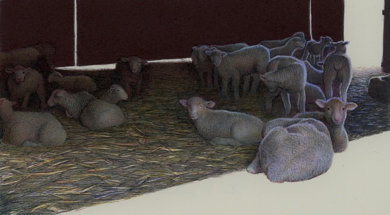 Nicolas V. Sanchez hanteert in zijn tekeningen onder meer de kleurenbalpen waardoor zijn tekeningen een onmiddellijk maar onwerkelijk karakter hebben. De geloofwaardigheid van zijn werk is zo hoog dat je meteen twijfelt aan je eigen waarneming. Je ziet een omgeving die het midwesten van Amerika in beeld brengt, een nogal desolaat maar desondanks aantrekkelijk gebied met schuren, stallen, silo’s, dieren, hekken, vegetatie, voorzieningen en mensen die een op zichzelf teruggeworpen en zelfstandige indruk maken, alsof ze zich er niets aan gelegen laten liggen dat er andere middelen van bestaan zijn dan waarvan zij afhankelijk zijn. Ze zijn in hun onderlinge samenhang afhankelijk van elkaar en dat maakt hun verschijningsvorm in het werk van Sanchez zo overtuigend. Opmerkelijk is dat zijn werk weliswaar in die verlaten landschappelijkheid van de grote vlakten is gesitueerd, maar dat het een huiselijke intimiteit heeft. Die ons vreemde omgeving komt daardoor heel nabij en die nabijheid is de verrassende kwaliteit in zijn werk. Hij brengt iets binnen bereik wat in feite ver van ons afstaat.