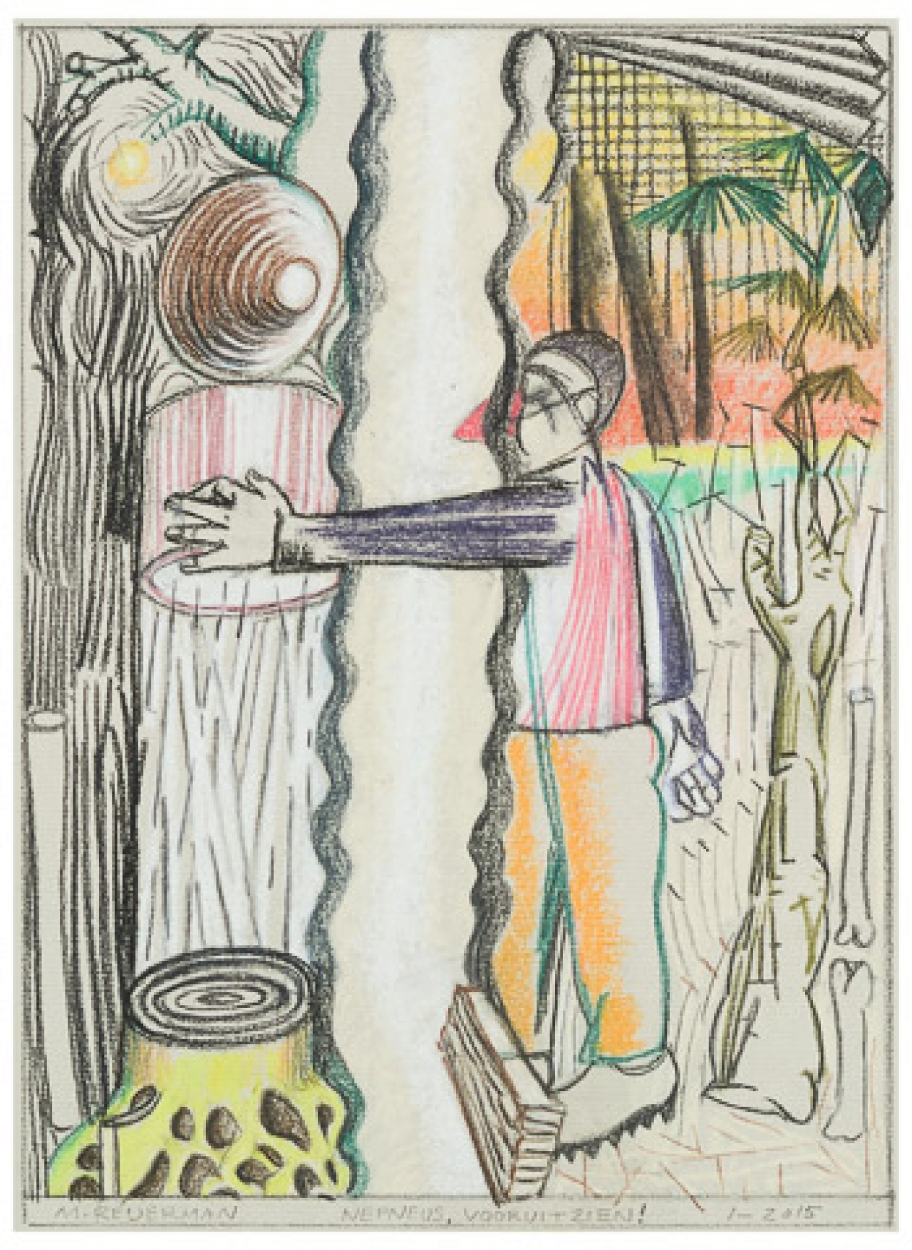 Marcel Reijerman is nooit uitgetekend zoals wij nooit uitgekeken zijn en zeker niet op zijn tekeningen. In zijn werk dat nooit vol genoeg kan zijn, zien we zoveel dat we meteen beseffen dat het misschien wel te weinig is. Er is altijd nog meer dat gezien kan worden maar niet is getekend. Er blijft maar één ding over en dat is bekijken wat je ziet. Wat er niet is, laat je over aan je verbeelding. Je ogen draaien in de tekeningen van Marcel Reijerman als een draaikolk in de rondte. Razendsnel tollen de beelden om je heen die je naar beneden zuigen en waarin je tenslotte verzuipt om naar adem happend proestend boven te komen, het water als een fonteintje uit je mond spuitend. Je voelt je als een kikker met de snavel van een reiger boven je die hopelijk door de vertekening die het water veroorzaakt net naast je zal spiesen en jij de dans kunt ontspringen.
