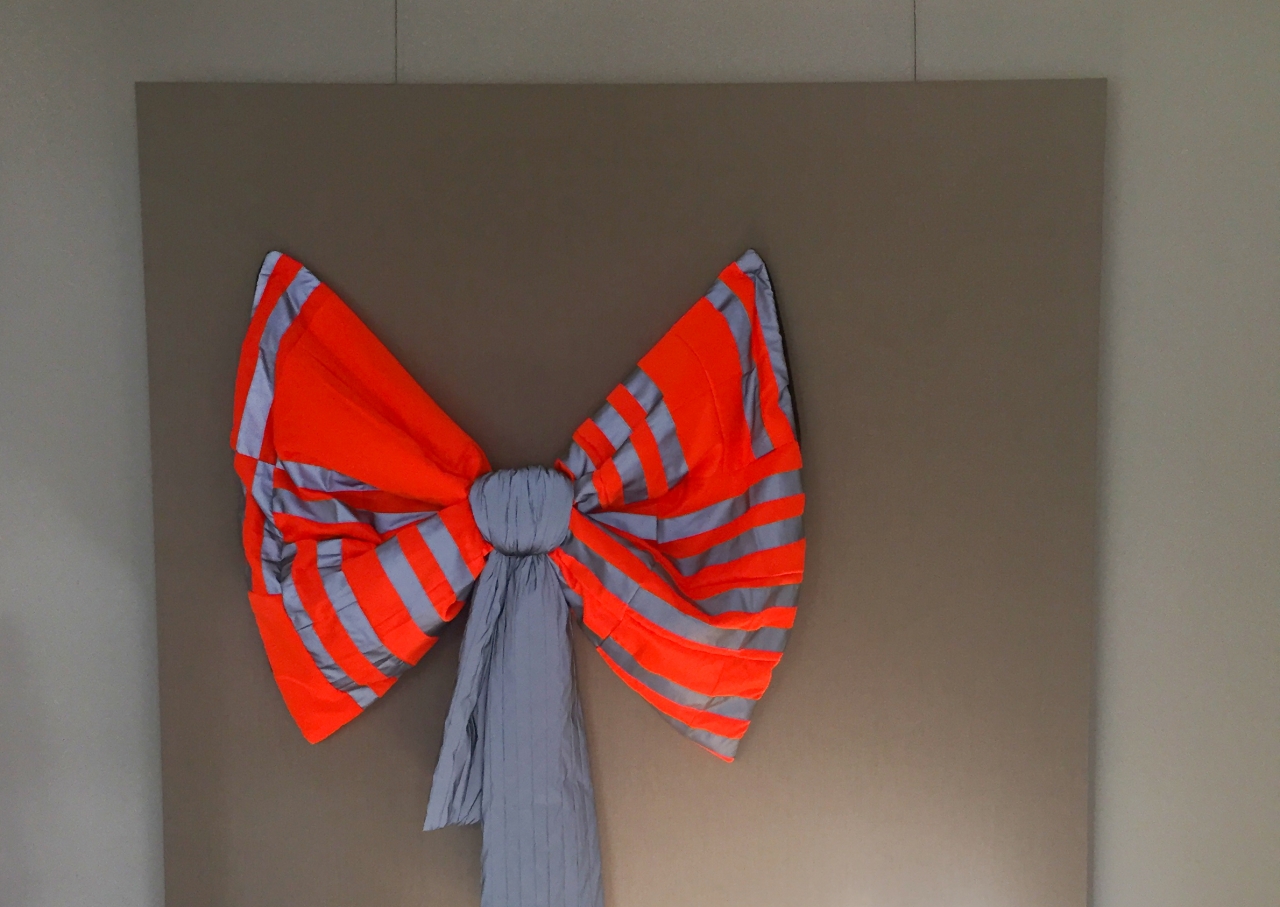Paijmans vertelt over zijn nieuwste werk en wijst naar de doeken die tegen de muur leunen. De vierkante stukken textiel zijn zo op het canvas gespeld, dat het grote strikken worden. ‘Stom en makkelijk’, zoals hij zelf zegt. Omdat hij zichzelf er soms op betrapt dat hij dingen onnodig moeilijk maakt en het daardoor laat mislukken, maakt hij nu schoon schip. Paijmans maakte de strikken voor de aankleding van zijn eigen trouwerij. ‘Ik was hoofd decoratie, dus voelde me verantwoordelijkheid dat het er gezellig uitzag tijdens het feest.’ Het valt me op dat er een rode draad te vinden is in de werkwijze van de kunstenaar: zo lijkt het werk van Paijmans te vertrekken vanuit een praktisch oogpunt. Wat begint bij het willen bedekken van de lelijke eettafel, het verlichten van de hoofdpijn van zijn vrouw en het verzorgen van de versiering op zijn bruiloft, resulteert uiteindelijk in een installatie of sculptuur.