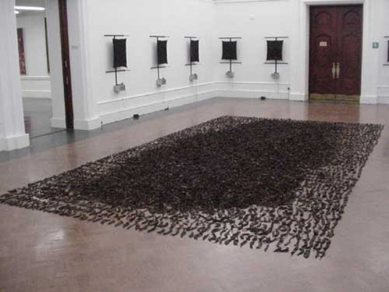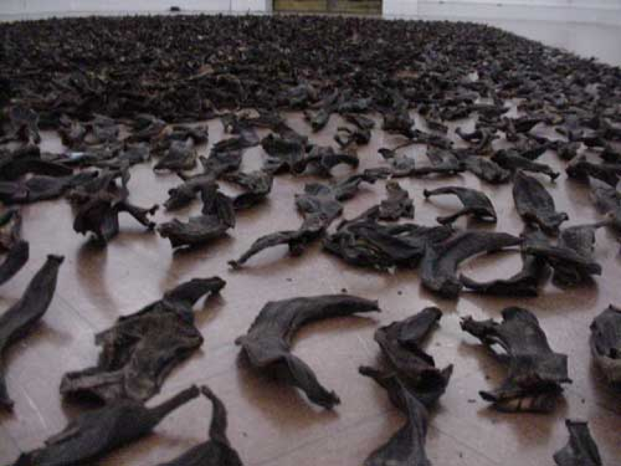 Ongeveer dertig jaar nadat Shelley Sacks op het idee kwam om haar eerste bananenschil te bewaren, was haar installatie klaar om geëxposeerd te worden. De gedroogde bananenschillen kregen een plek op de vloer van de expositieruimte, zodanig vormgegeven dat het van een afstand net een zwerm vogels leek die plotseling ‘uit de lucht’ was gevallen, maar van dichtbij waren het onmiskenbaar gedroogde bananenschillen: stijf en bruin, met een geweldige dreiging om hen heen. In hun vergane vorm vertelden de bananen een groot politiek, ecologisch en sociaal verhaal. Ze vormden een ‘social sculpture’ zoals Sacks het noemde.