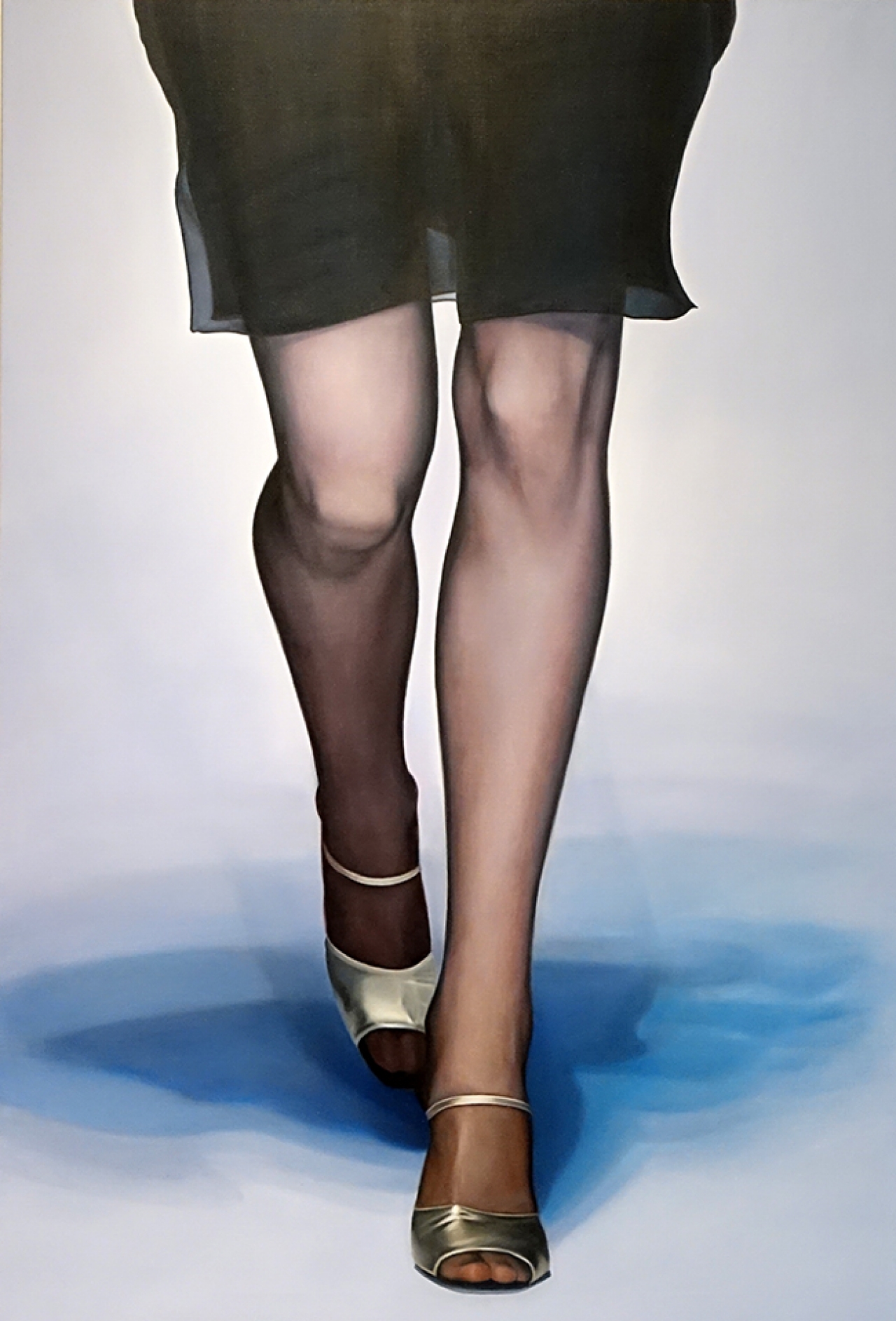 De imperfectie die af en toe in het perspectief terugkomt is een prettige nuance in het desolate werk en lijkt te dienen als communicatiemiddel tussen het werk en de bezoeker. Zo zijn de in panty gestoken benen anatomisch verdraaid. De tenen die door de neus van de elegante schoen gestoken zijn, lijken vast te zitten en strak te worden getrokken door de panty maar toch zou ik de stof willen voelen.