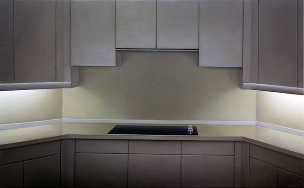 Verlaten staat de keuken klaar om opgeleverd te worden aan een nieuwe eigenaar, te wachten tot er gekookt en gepraat wordt om elkaar te vertellen hoe de dag verliep. Het kunstmatige licht dat over zijn lege aanrechtblad schijnt benadrukt het nog niet gebruikte fornuis en de greeploze lades: sereen, stil en eenzaam, wachtend op wat komen gaat.