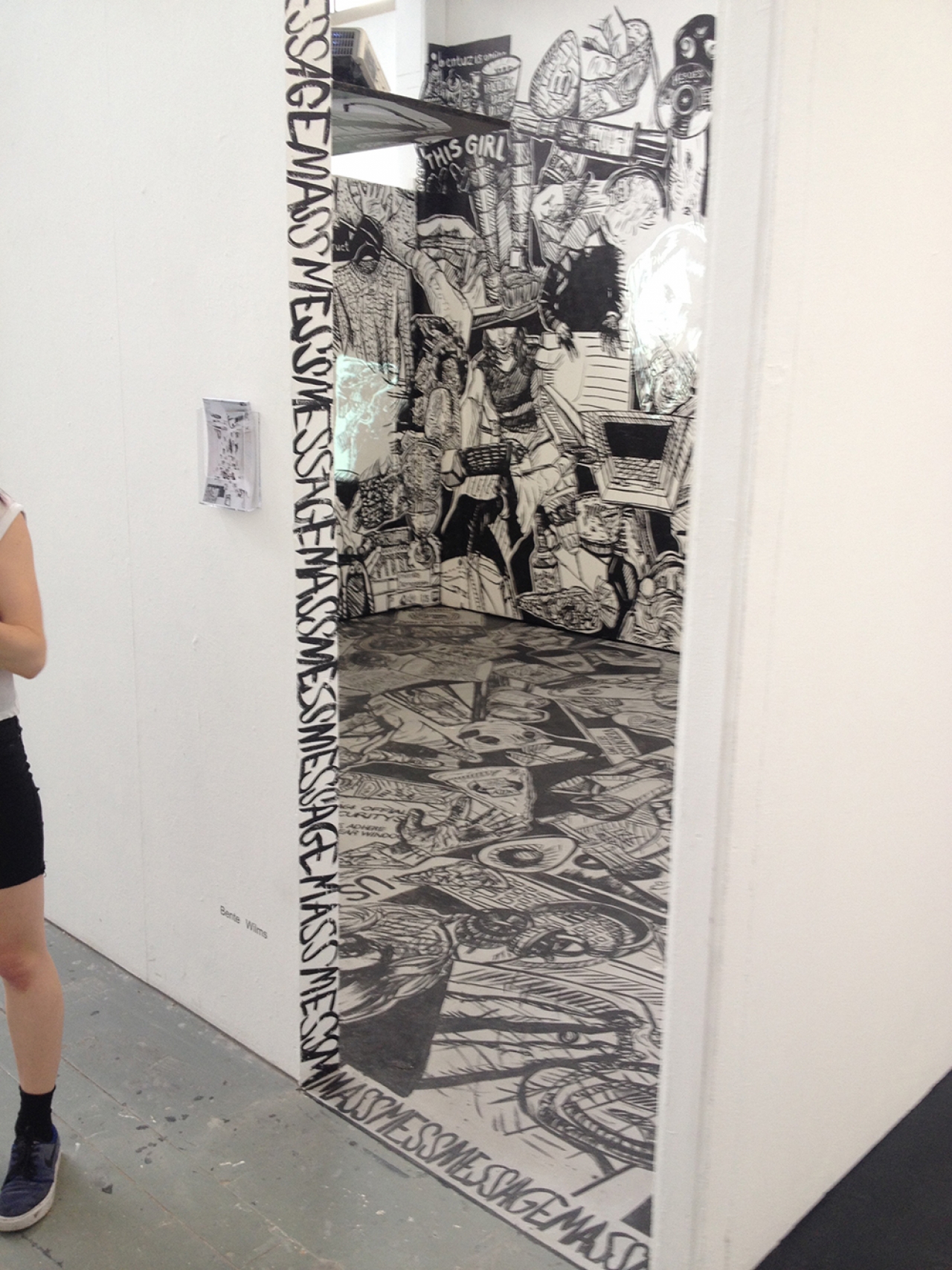 Bente Wilms, is een tekentalent vol eigenzinnige en rauwe randjes. Denk aan comics zoals Robert Crump, de energie van Erik van Lieshout met een vleugje van de Pop Art met zijn blik op het alledaagse. Het alledaagse in de mix, met veel strip? Ze vertelt dat het wel klopt: “ja, ik heb inderdaad erg veel strips gelezen”. Wat een stoere dame is dit, met een museaal verantwoorde installatie – ik wil hier meer van zien. Visueel, inhoudelijk en op persoonlijke wijze actueel – alle tekeningen blijken te zijn gemaakt van haar whatsapp communicatie. De foto’s die zij en vrienden elkaar sturen.