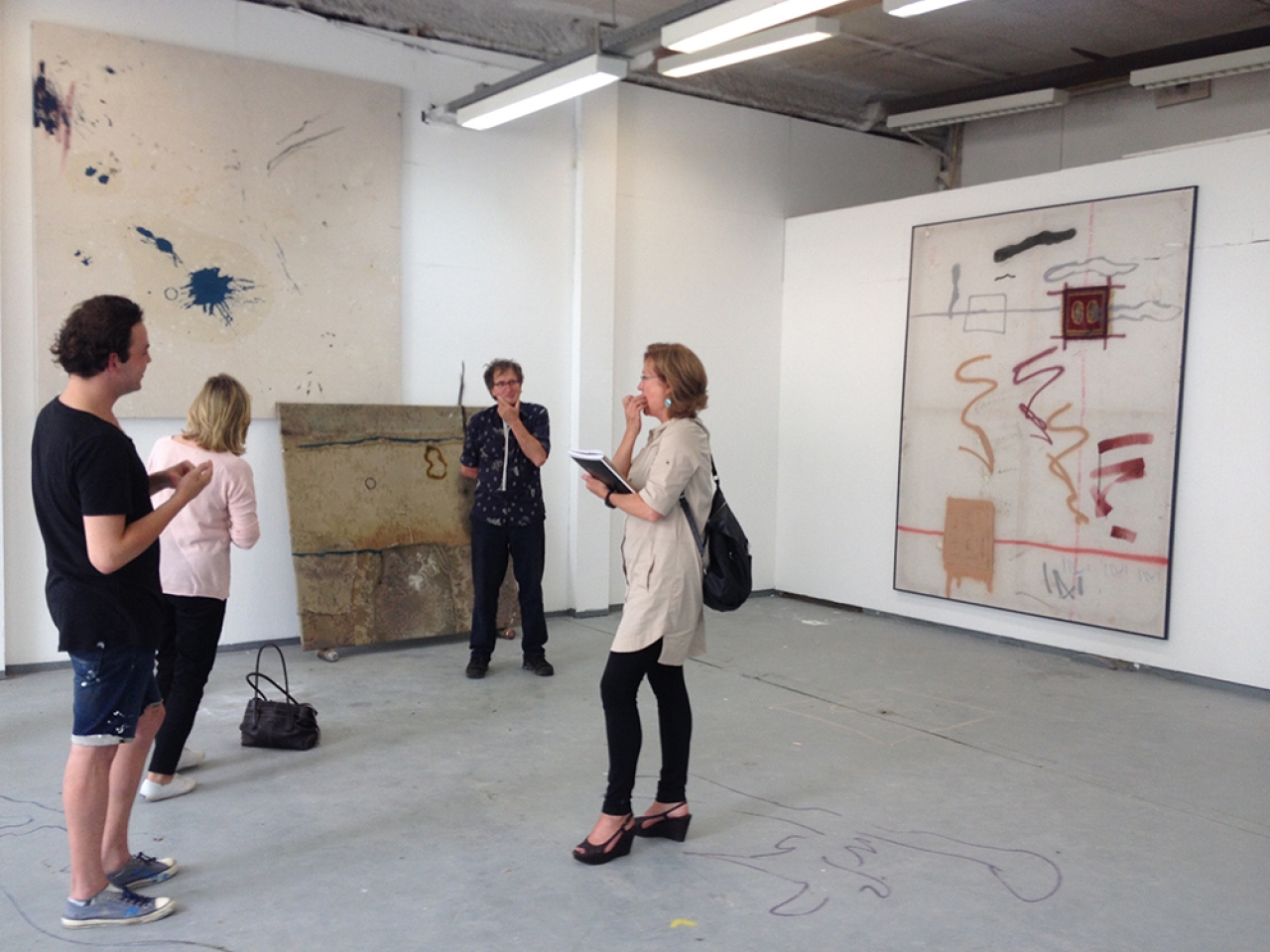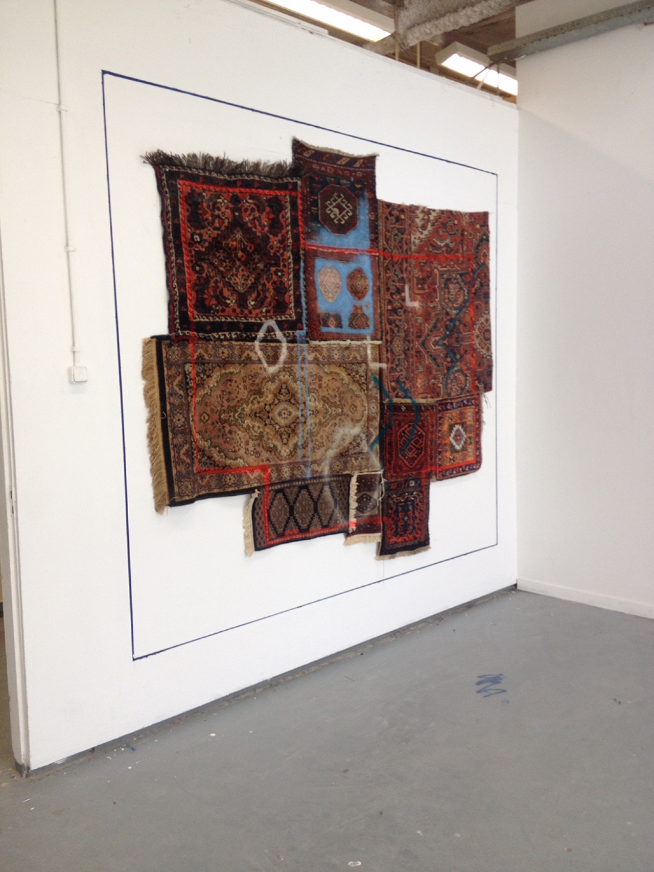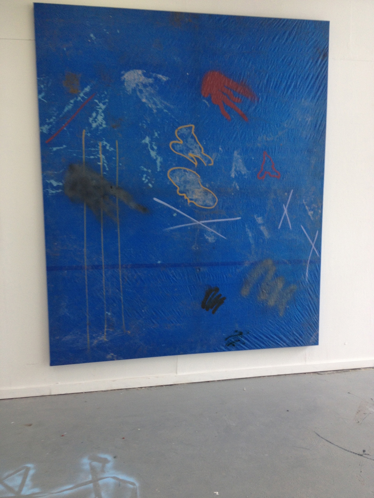 Thomas Westphal, wat een heerlijk werk is dit. Het overtuigt, is stoutmoedig, eigenzinnig en heel erg in deze tijd. Hij had zo bij de recente Offspring van De Ateliers kunnen zitten. Wie weet binnenkort? Grote doeken, tapijten, opgespannen stukken zeil. Het werk houdt het midden tussen schilderen en beeldhouwen. Hij gebruikt verschillende – gevonden – ondergronden waar al het nodige aan gebruikssporen op is achtergelaten. Voetstappen, verf vlekken, stofpatronen. Hij eigent dit toe, spant het op en voegt er nog een laatste kleine tekening aan toe. Zijn werk ademt sporen van Joseph Beuys en Basquiat, maar of dit bewuste referenties zijn, laat hij in het midden.