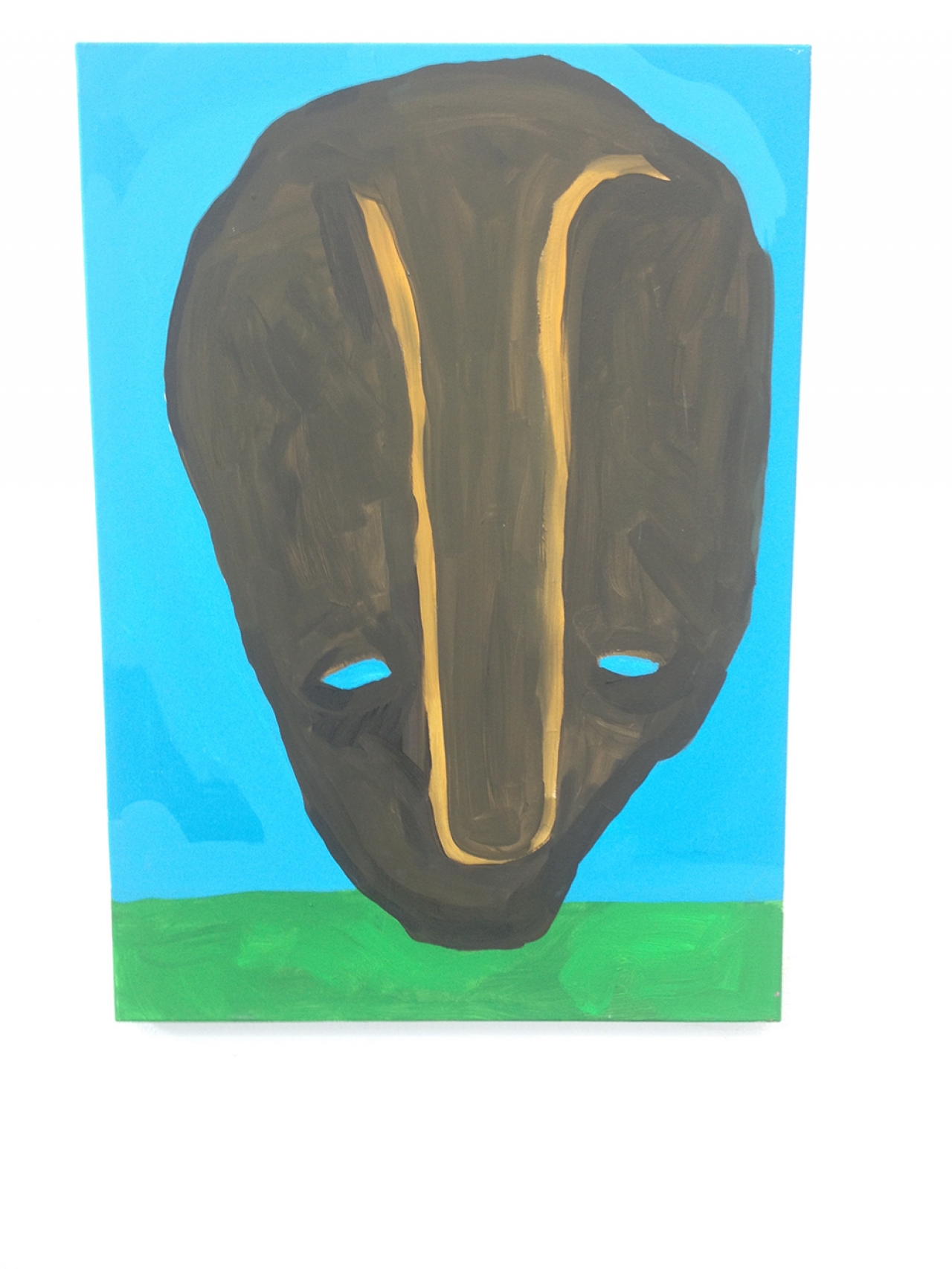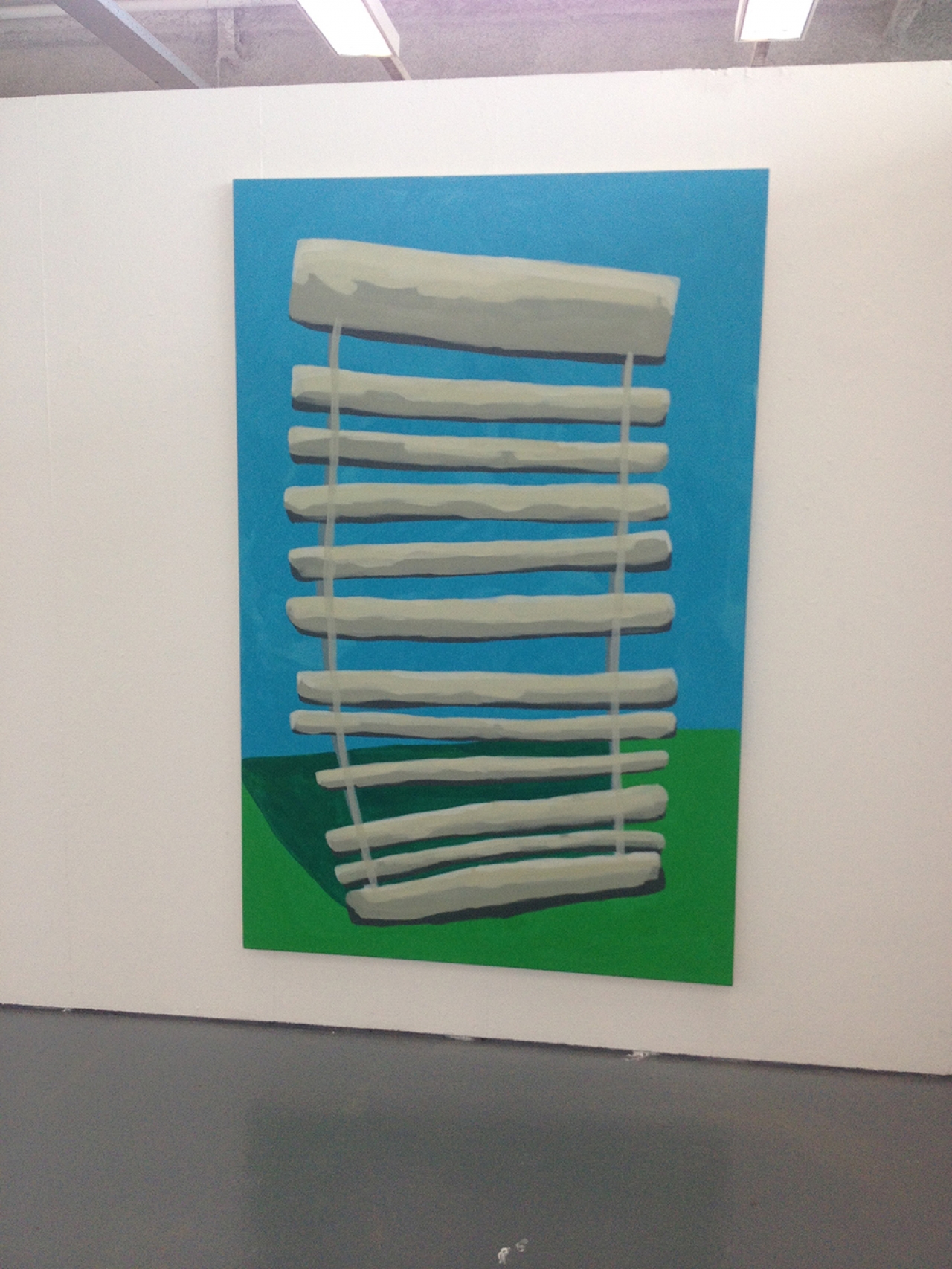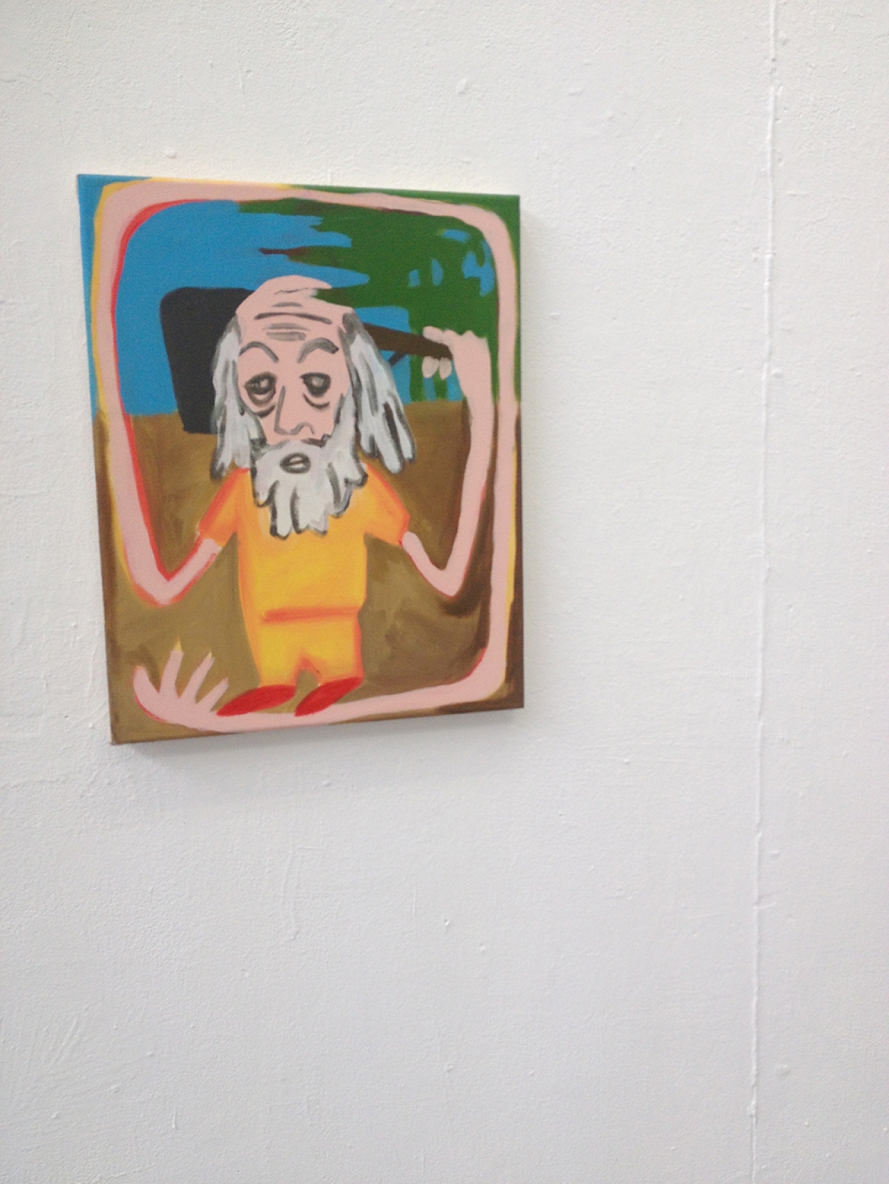 Thomas Westphal, wat een heerlijk werk is dit. Het overtuigt, is stoutmoedig, eigenzinnig en heel erg in deze tijd. Hij had zo bij de recente Offspring van De Ateliers kunnen zitten. Wie weet binnenkort? Grote doeken, tapijten, opgespannen stukken zeil. Het werk houdt het midden tussen schilderen en beeldhouwen. Hij gebruikt verschillende – gevonden – ondergronden waar al het nodige aan gebruikssporen op is achtergelaten. Voetstappen, verf vlekken, stofpatronen. Hij eigent dit toe, spant het op en voegt er nog een laatste kleine tekening aan toe. Zijn werk ademt sporen van Joseph Beuys en Basquiat, maar of dit bewuste referenties zijn, laat hij in het midden.