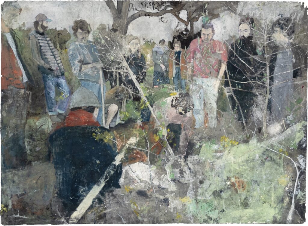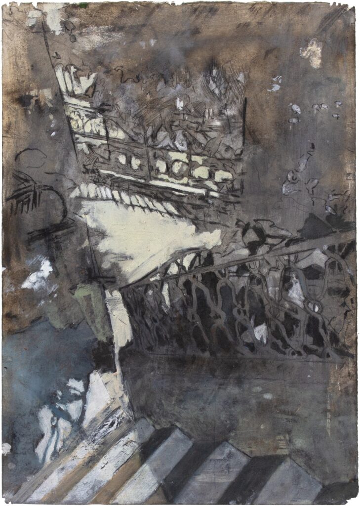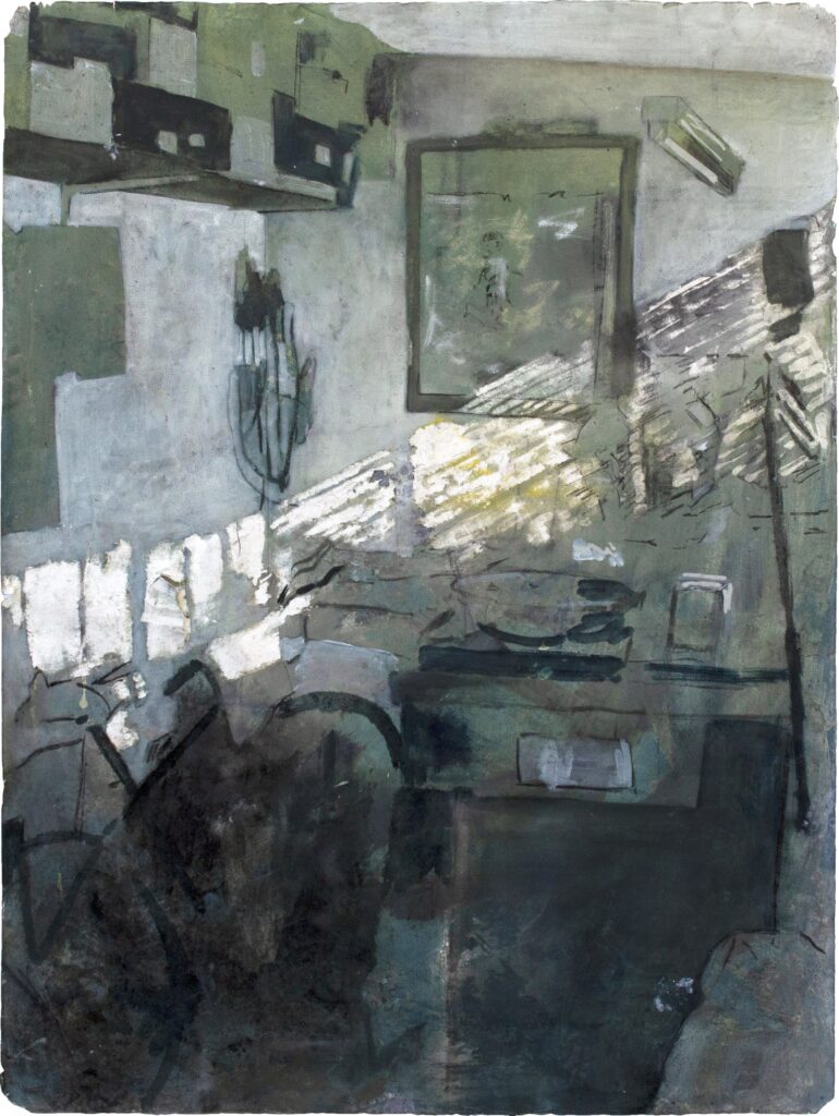 Als het droogt, wordt het water geabsorbeerd door het papier, het wordt een deel van het materiaal omdat de samenstelling van de vezels verandert. Bij mijn schilderijen of tekeningen staan wel omschrijvingen als ‘olieverf op papier’, maar eigenlijk kun je dat zo niet zeggen. De materialen hebben zich verenigd. Op doek gebruik ik meestal olieverf. Papier geeft me de mogelijkheid om te experimenteren, dan gebruik ik verschillende soorten verf door elkaar. En veel water. Het medium is geschikt voor hoe ik te werk ga. Ik schilder laag op laag en met een schuurmachine kan ik eenvoudig iets verwijderen, terug in de tijd naar een vorige versie. Je kunt ook een schuurmachine gebruiken op doek, maar dan vind ik het resultaat minder mooi. Ik heb ook andere manieren om verf te verwijderen, met een krabber of een gum. Voor mij is die afwisseling van schilderen en verwijderen spannend, omdat ik soms vergeet wat er onder een laag zit. De volgorde staat bij mij ook niet vast. Meestal begin je met een ondertekening of een eerste schets en ga je dan pas schilderen, maar bij mij loopt dat al meer door elkaar. Ik teken en schilder en schilder en teken. Chaos.