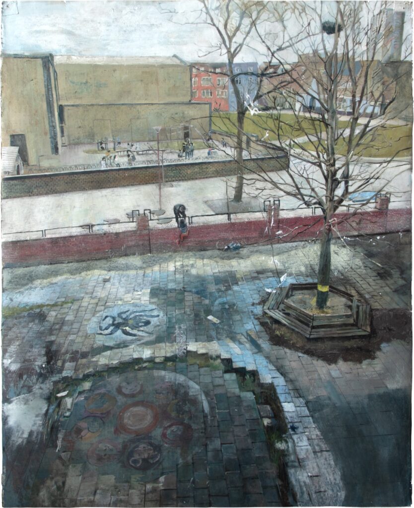 Children of the Neighbourhood zou ik wel echt een schilderij noemen omdat ik voornamelijk olieverf heb gebruikt en er lang aan heb gewerkt. Het is het uitzicht uit het raam van mijn atelier. Ik was net afgestudeerd en had een soort artist’s block. Dus ik ben met dit uitzicht begonnen, want dat doe ik vaker, werken vanuit mijn directe observatie. Wat kom ik in mijn atelier tegen of wat neem ik waar als ik naar buiten kijk? Op dit schilderij zie je spelende kinderen op het plein van de nieuwe school tegenover mijn atelier en een man die over een muurtje buigt. Ik heb niet altijd mensen geschilderd. Voorheen was ik vooral geïnteresseerd in sporen, zoals een achtergelaten koffiekopje. Dat roept een mysterieuze sfeer op. Misschien komt het doordat ik de laatste jaren meer fictie ben gaan lezen, want op een bepaald moment begon ik personages in mijn schilderijen te plaatsen. Dat geeft een narratief hoewel ik toch dat mysterieuze wil behouden. Ik heb maanden aan dit schilderij gewerkt, langer dan ik normaal zou doen, want ik wilde voor mezelf de grens verleggen door telkens te kijken of dit het beste is wat ik kon maken. Al werkend liet ik me inspireren door oude Vlaamse en Nederlandse schilders, zoals Vermeer, met zijn aandacht voor detail of het werk van de Spaanse realist Antonio López García, van wie laatst nog een tentoonstelling te zien was (in het Drents Museum, red.). Zij vertonen een vertrouwdheid met hun onderwerpen waarnaar ik voor dit schilderij ook op zoek was, een dagelijkse intimiteit met wat ik wilde vastleggen.