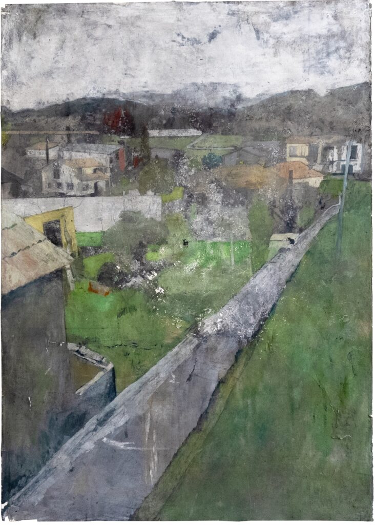 Inderdaad. Op dit schilderij heb ik voor de eerste keer auto’s geschilderd, daar was ik sceptisch over, maar ik ben tevreden met hoe dat heeft uitgepakt. Het zijn symbolen van onze tijd. Door mijn interesse in oudere schilderkunst vroeg ik mij af hoe ik nieuwe objecten vanuit die traditie kan afbeelden. Mijn schilderijen laten vaak een sfeer van verval zien, van aftakeling. Daarom is mijn kleurenpalet zo ingetogen. En papier kun je er goed ‘oud’ uit laten zien, alsof het vaak is gebruikt.