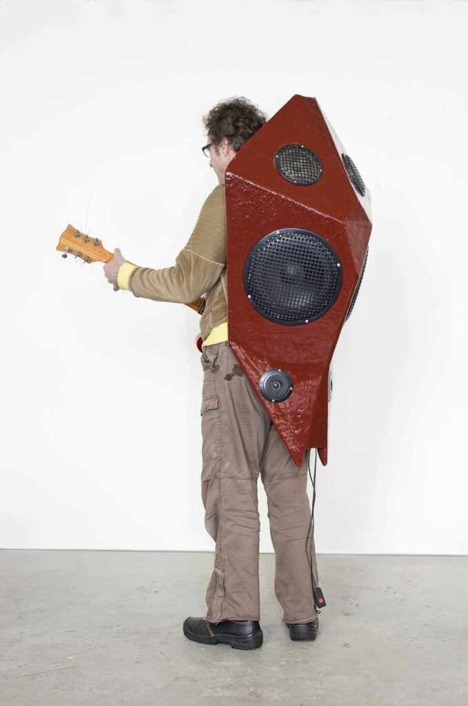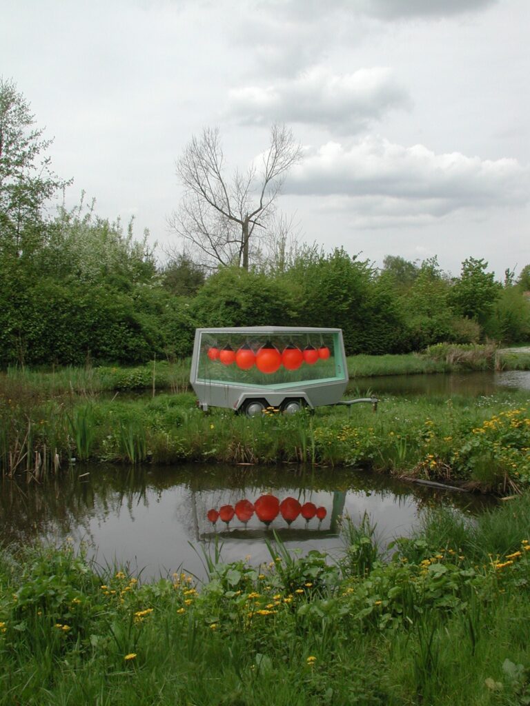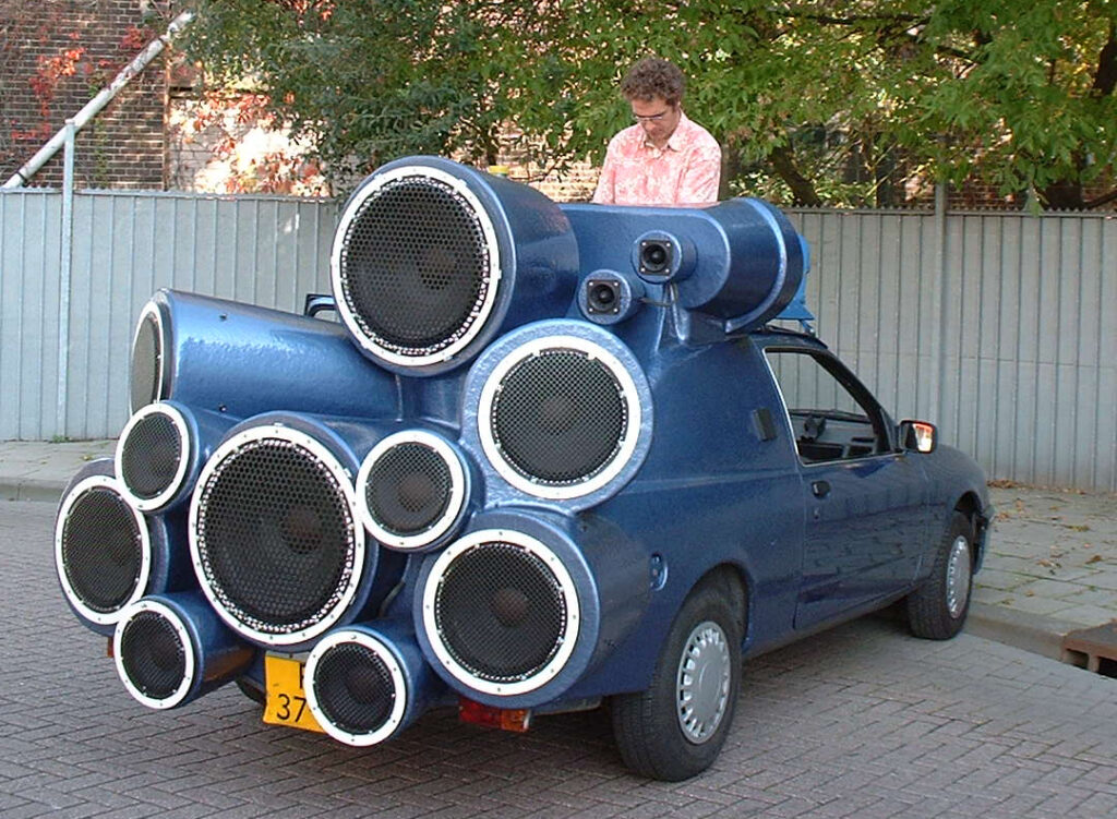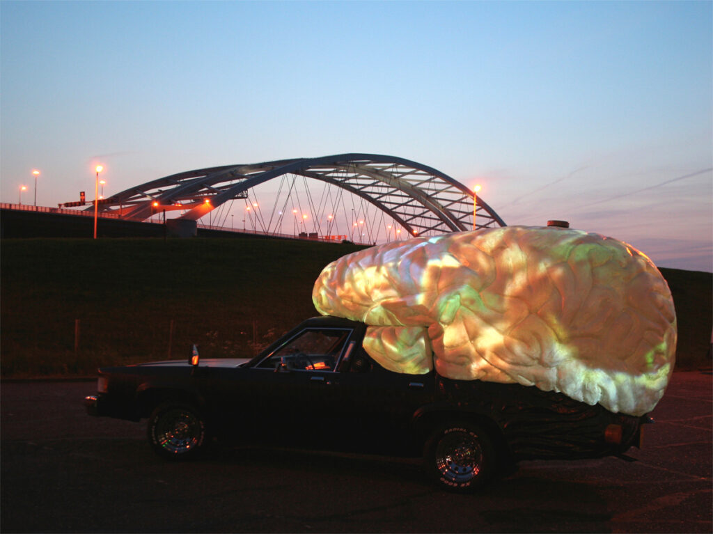 ‘Door de jaren heen heb ik een steeds grotere hekel aan het verkeer gekregen. Het is gevaarlijk, omdat mensen zich agressief en onbeleefd gedragen met uitwassen als het rijden onder invloed van lachgas, naast alcoholgebruik en telefoneren en appen tijdens het rijden. De Chesterfield was nog een hele lieve auto die ik maakte door het bewerken van een kleine Engelse auto, de Standard Ten. Dat leverde een beeld op dat paste in de verzameling surrealistische kunst van Boijmans Van Beuningen. Inmiddels ben ik druk bezig afstand te doen van de verheerlijking van de auto door te suggereren dat er angstaanjagende mutaties ontstaan door genetische manipulatie. Ik kweek in mijn laboratorium autospermatozoïden waaruit als het ware organische misfits ontstaan die laten zien dat het de verkeerde kant opgaat. Ik laat de wereld zien als een autokerkhof, een zwartgeblakerde globe bedekt met wrakken. Ik presenteer de auto als een virus, zoals de naam van de Volkswagen T5 ook onwillekeurig naar een virus verwijst, de bacteriofaag T5 die specifiek E. colibacteriecellen infecteert. Ik laat zien dat de auto gedoemd is de fossiele gedaante van onze tijd te worden. Mijn DJ Mobile kent nu een variant als Doomsday Soundmachine. Ik bedrijf letterlijk een vorm van Carcheologie, een museaal paviljoen waarin ik een verzameling laat zien van artefacten uit een beschaving die ten onder is gegaan aan de verbrandingsmotor.’