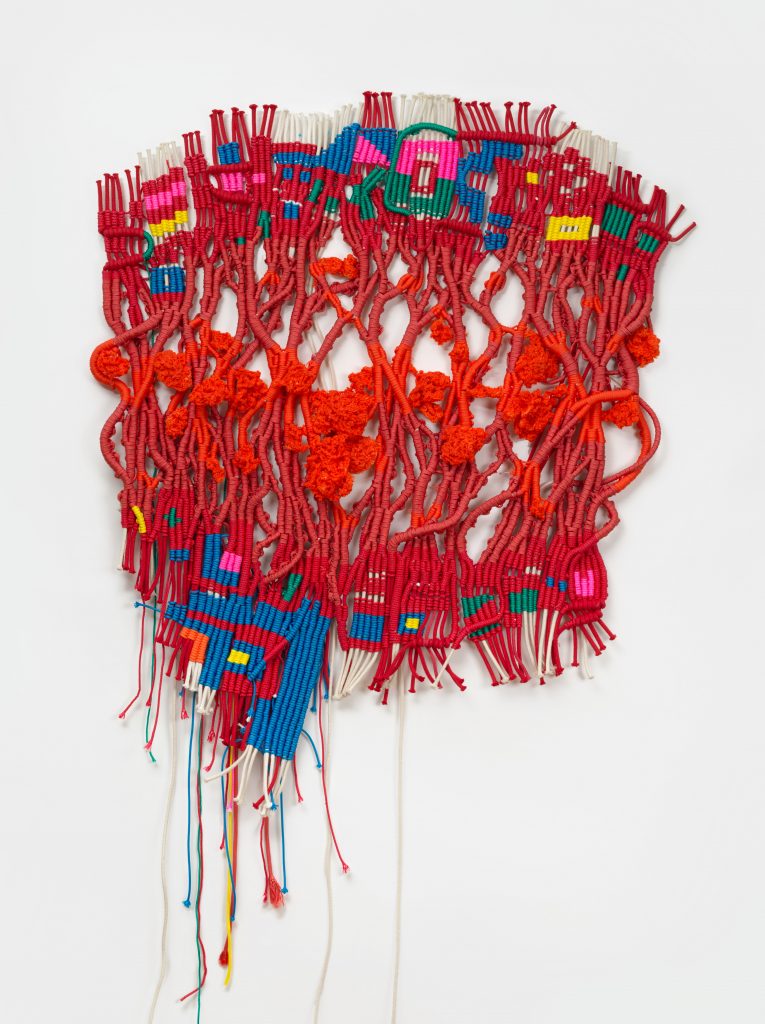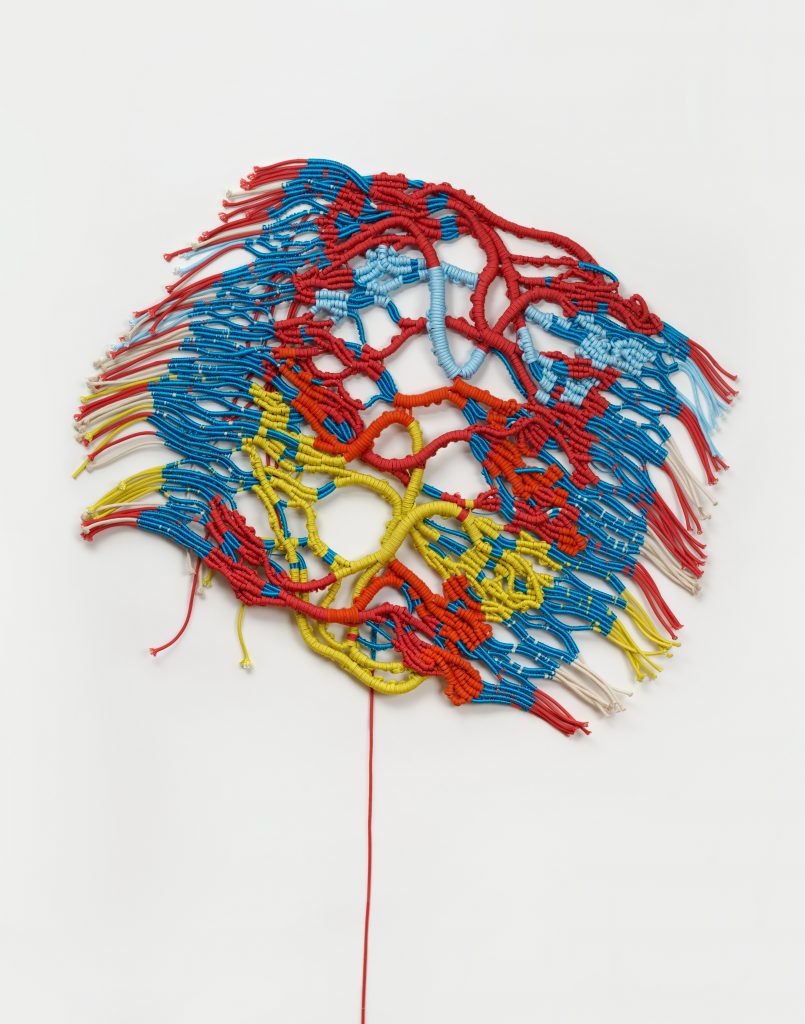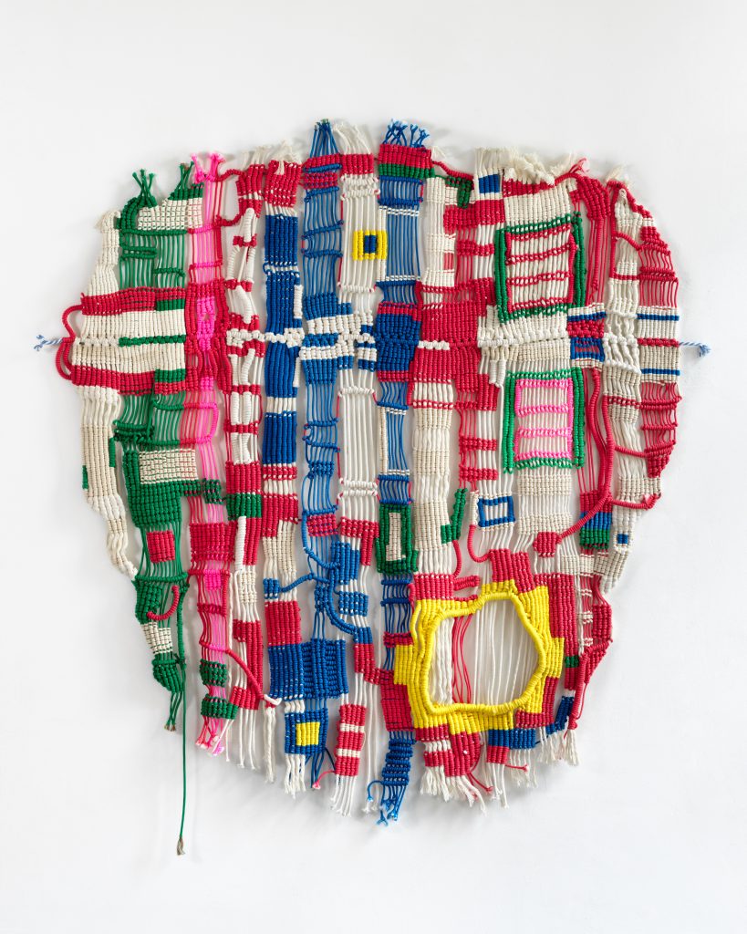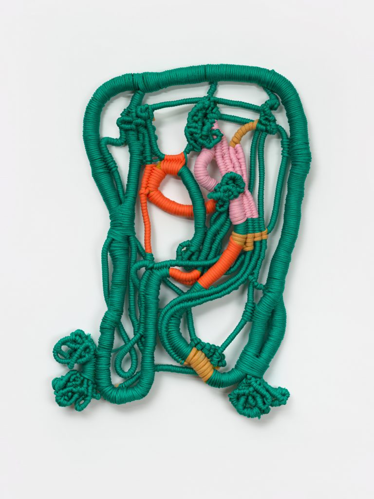 In het begin hadden haar textiele werken nog een gebruiksfunctie. Een van de werken in de tentoonstelling ziet er grauw en platgetrapt uit, wat ook werkelijk het geval is. “Dat werk heeft een paar jaar dienstgedaan als vloerkleed in mijn huis en zag er eerst veel frisser uit.” De touwwerken die ze sinds 2017 maakt, begon ze in samenwerking met een touwfabriek die haar de veelal synthetische materialen beschikbaar stelde. De vlecht- en knooptechnieken die ze zich eigen maakte, leverden een aantal werken op met de voor haar zo typerende open ruimtelijkheid. De mazen in het net, de gaten in het raster dragen bij Bennema net zo bij aan de aan de aard van de compositie als het tastbare materiaal. De textiele objecten hebben een abstracte, vloeibare gedaante die wordt versterkt door contrastrijke, felle kleurstellingen. Anders dan haar schilderijen zijn deze textielreliëfs lastiger onmiskenbaar als werk Aafke Bennema te identificeren. Naarmate ze er meer maakt, ontstaat uit haar persoonlijke handschrift toch het opengewerkte en transparante beeld dat ook haar schilderijen hebben. Waar in haar schilderijen tastbare, dode objecten een amorf en universeel levendig aanzien krijgen, ontwikkelen haar textiele werken als handmatige gevormde structuren een vangnet voor ideeën.