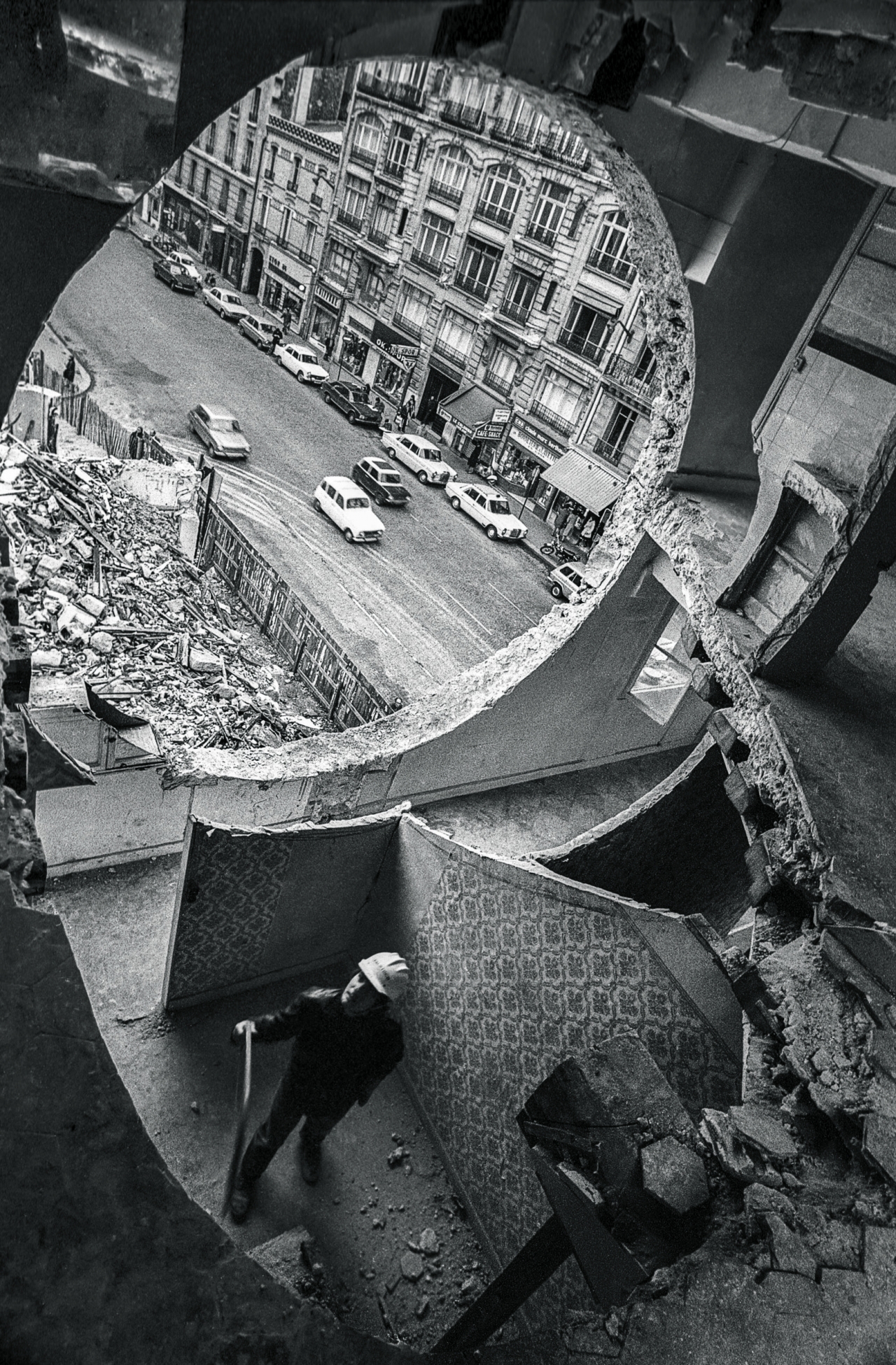Voor cut-out werken als Conical Intersect en Day’s End, beiden uit 1975, maakte Matta-Clark met een kettingzaag grote gaten in verpauperde flatgebouwen en loodsen in het centrum van steden. De gaten wierpen een blik naar binnen, maar openden de bouwwerken vooral ook naar buitenlucht en -licht. Ruïnes worden gedefinieerd door hun ineenstorting, die openingen biedt waar de externe wereld binnendringt. De bedoeling van een bouwwerk, namelijk het beschermen tegen de buitenwereld, gaat hiermee verloren. Matta Clark’s cut-outs bevragen het onderscheid tussen binnen en buiten in zijn geheel, door het proces van ruïnering te versnellen en tentoon te stellen als kunstwerk. Hij drijft het gebouw voorbij haar gecultiveerde functionaliteit, zonder het volledig af te breken. Muren die zich eerst leenden voor ordening en inkadering, worden geperforeerd en daarmee permeabel. Het is niet voor niets dat de afbrokkelende bouwvallen van het New York van de jaren ‘70 voor veel kunstenaars een inspiratiebron waren, zoals ook voor Joan Jonas, die intuïtieve video’s maakte in onbebouwde kavels vol puin met Matta-Clark als figurant, en voor Charles Simonds, die lacunes in gebouwen vulde met miniatuur-ruïnes die hij Dwellings noemde. De negatieve ruimte was voor hen een gedecentraliseerde speelplaats.
