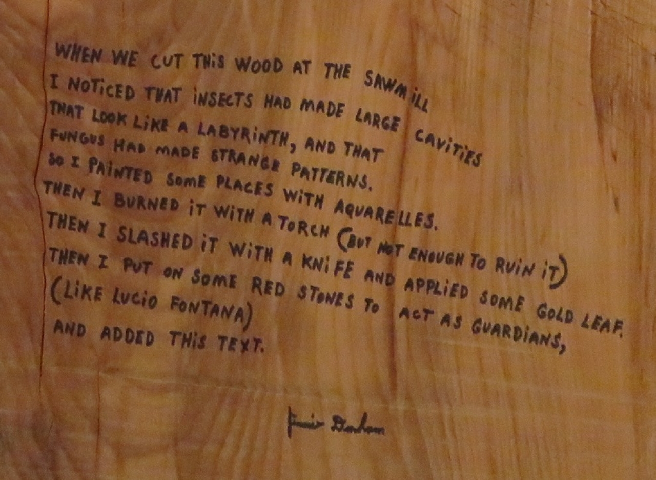De Labyrinth-serie accentueert de trauma’s die zich dikwijls onder het oppervlakte bevinden. Jimmie Durham positioneert zichzelf in deze performatieve sculpturen niet zozeer als schepper, maar als iemand die verval in de hand werkt. Hij verwijst met zijn ‘CUT THIS OFF’ naar de afwezigheid die noodzakelijkerwijs gepaard gaat met de aanwezigheid van de uitgesneden, opengewerkte vorm, en roept hiermee vragen op over de negatieve ruimte van het kunstwerk. Want wat valt er te zeggen over werken die niet meer zijn dan hun negatieve ruimte? Wanneer het de bedoeling van de kunstenaar is dat er, zoals bij het laatste beetje van stuk zeep, slechts een schim of een schilfer achterblijft? Hoe benaderen we het kunstwerk waarvan de betekenis ligt in diens ruïnering en verval, in de wankele openingen tussen broze botten? En hoe kan de kunst van het weghalen een gebaar op zich zijn?