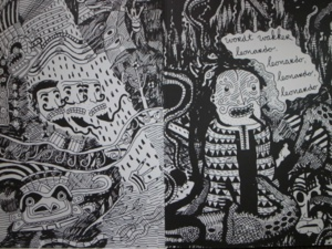Maar wat MAAKT Jip dan? Hij tekent, als een bezetene, doorlopend, altijd. Hij kan niet stoppen. Prachtige tekeningen waar die obsessie vanaf spat. Iedere tekening fonkelt en barst uit z’n voegen. Ik vroeg hem eens om de binnenkant van een map te tekenen en weer zo’n wondervolle overvolle pagina,