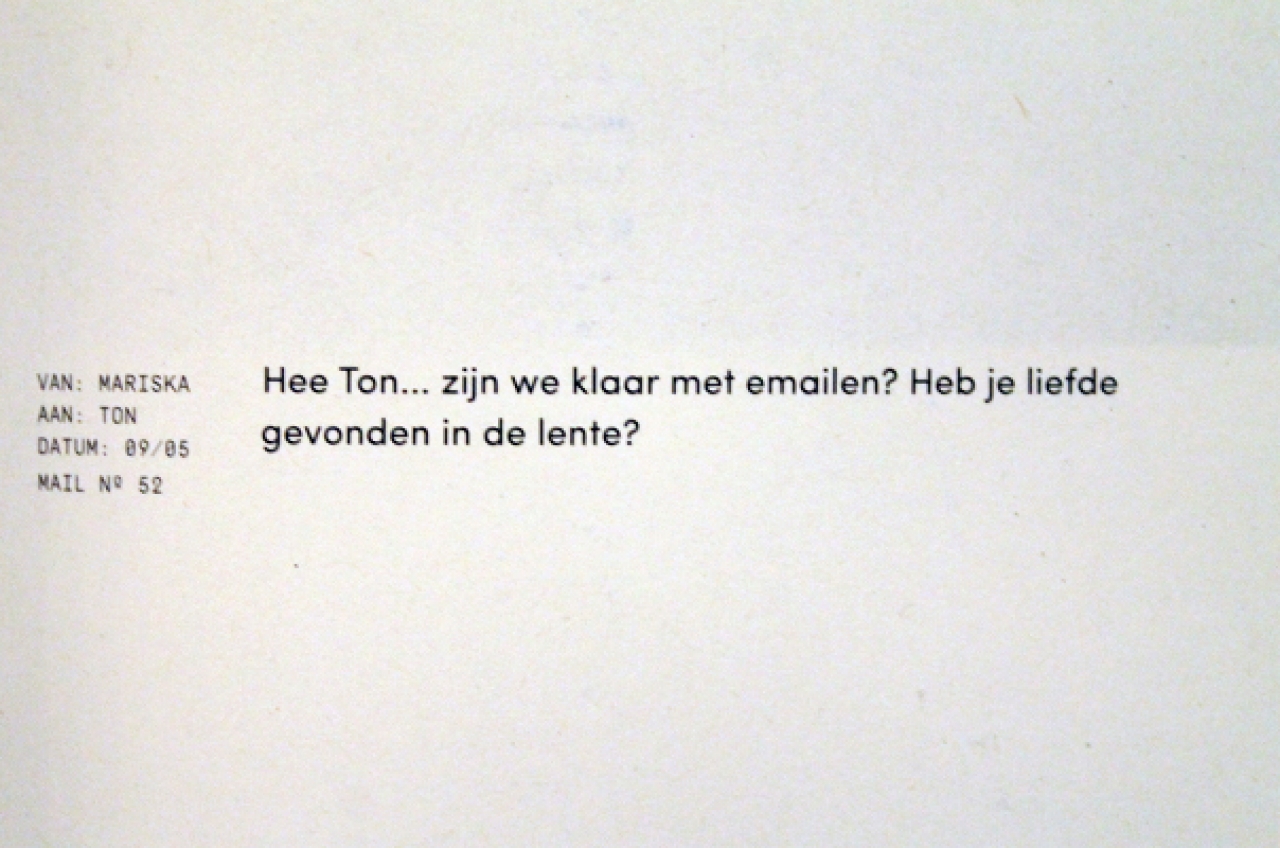 De mailwisseling leest als een roman, het zijn korte stukjes met licht en zwaarder leesvoer. Filosoof Heidegger, betonnen schuttingen, het woord ‘tegemoet’ worden besproken. Daarnaast gaat het gros van de mails over harstocht, scheiden is lijden en daten. De woorden zijn misschien beter dan de gesprekken die de twee ooit zullen voeren. Ze zijn afgewogen, gebackspaced en opnieuw geformuleerd. Spontaniteit komt af en toe voorbij in de snelle reactie, maar geven geen beeld van hoe iemand op je zou reageren in een gesprek. De vraag of de ander al een nieuwe date heeft gevonden wordt meerdere malen gesteld, omdat een verstandhouding van woorden nou eenmaal moeilijker is te duiden. Angst en twijfel kun je tussen de regels lezen, angst om opnieuw verlaten te worden. Zeker als er een paar dagen niet wordt gereageerd.