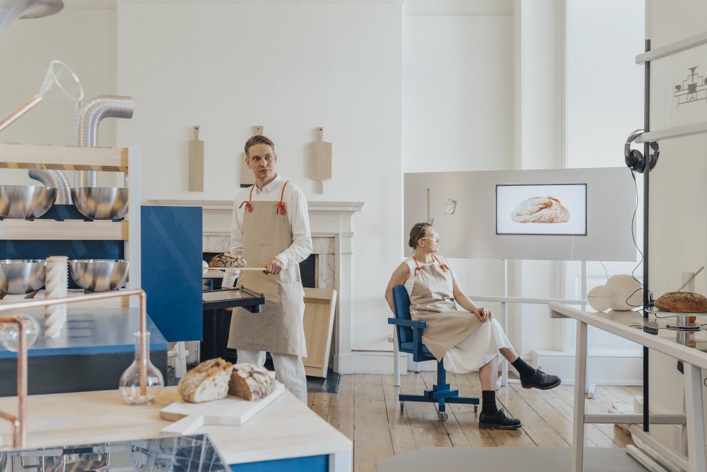 Maciej Chmara, een van de twee kunstenaar-ontwerpers die aan het werk zijn in het paviljoen, gaat dieper in op de materie: het gaat hen om de samenwerking met de micro-organismen in het zuurdesem en hoe het brouwen van bier en bakken van brood waar we in een ver verleden mee begonnen zijn, de micro-organismen die in en op ons leven hebben beïnvloed. Het is een samenwerking die via kneden, kauwen, verteren en uitscheiden nieuwe processen en constellaties in het leven roept. In de presentatie staat het multisensorische centraal: er is de geur van versgebakken brood, er is het geluid van een metalen pin die over de korst van een roterend brood knarst, er zijn de ronde druppelvormen die refereren aan de micro-organismen die verantwoordelijk zijn voor het gistingsproces en er is brood om te proeven.