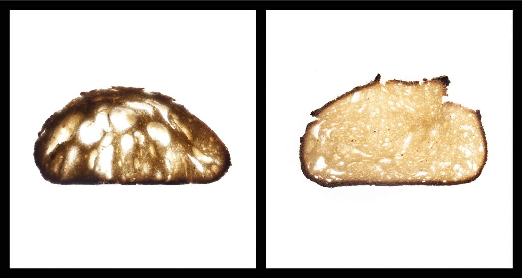 Het doet me denken aan een flesje gebotteld water dat thuis in mijn kast staat. Als je door het glas kijkt, zie je een sticker met daarop de tekst ‘Let us meet inside you’. Het flesje maakt deel uit van een kunstwerk van Navid Nuur, Untitled (Let Us Meet Inside You) (2005-2013). Jaren geleden, in 2010 en in wat toen nog De Hallen Haarlem heette (nu Frans Hals Museum, locatie ‘Hal’) zag ik een installatie van stapels kratten, lege flesjes, een kroonkurkmachine en een kraan. Deze kraan had Nuur gedemonteerd uit zijn eigen studio en aangesloten op het waternet van het museum. De gebottelde flesjes kraanwater konden door de bezoeker voor een klein bedrag (ik meen 1 euro) worden gekocht. Daarmee werd het geheel van het kunstwerk verdeeld over verschillende mensen. Een collectief lichaam, dat allemaal ‘us’ tot zich kon nemen, maar waarschijnlijker geneigd was het flesje op een zichtbare plek neer te zetten. Als een reminder aan hoe intiem onze omgang met alledaagse dingen eigenlijk is. Wat het betekent om letterlijk iets tot je te nemen en hoe dat een ontmoeting is. Het werk van Nuur is een subtiele omlijsting van het collectieve, het gedeelde. Zo liet hij voor een tentoonstelling in het Bonnefanten bij binnenkomst clipjes uitdelen met de tekst ‘We share air’. Het tot ons nemen van brood, en de verschillende vormen waarin dat gebeurt, is eveneens een intieme ontmoeting die veel in beweging zet, zo laten kunstenaar-ontwerpers Maciej Chmara en Anna Rosinke zien.