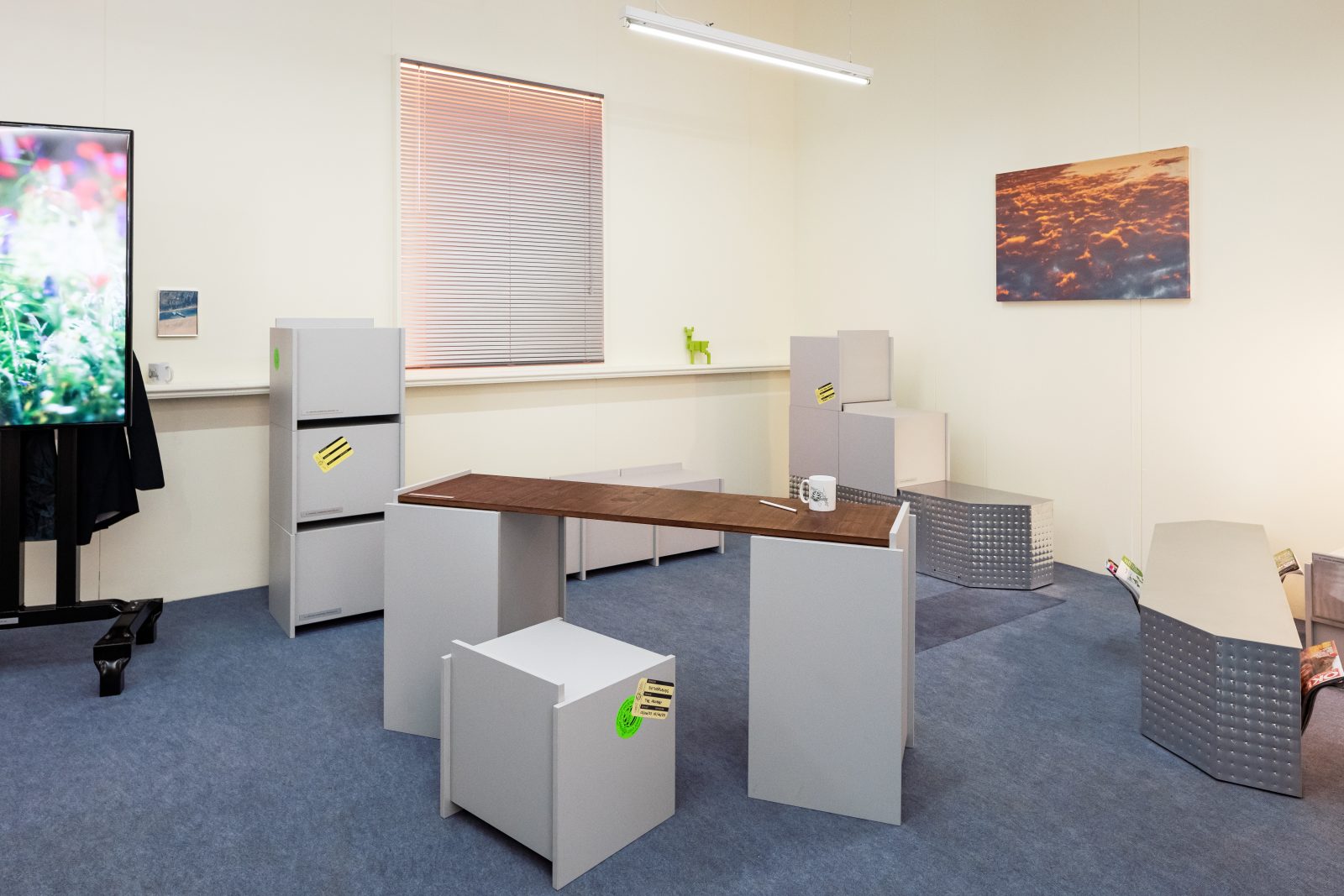 Of wellicht kunnen er op den duur een aantal raampartijen gestald worden in het naburige paviljoen van Nederland? Dit paviljoen, Out of joint, tilt samenwerking en het delen van middelen namelijk naar een heel nieuw niveau. In een ruimte die is ingericht als een kantoor staan modulaire elementen die samen bijvoorbeeld zitmeubelen, een bureau of katheder kunnen vormen. Ook in het vertrek: een plastic plant, mokken, een paraplubak, en een hoog archiefmeubel met daarin ordners met de namen van de deelnemende landen erop. Het concept, zo vertelt curator Colin Keays me, is dat elk deelnemend land de elementen uit het Nederlands paviljoen kan lenen. Daartoe is niets minder dan een bureaucratisch systeem ontwikkeld: er moet een formulier ingediend worden met de aanvraag en de periode dat het stuk geleend gaat worden. Deze bureaucratie is een knipoog naar de plek waar de biënnale plaatsvindt: Somerset House. Hier huisden in het verleden onder meer de administratieve afdelingen van de Britse belastingdienst en de Royal Navy. Ook in het ontwerpteam dat aan het paviljoen werkte – bestaande uit Fabulous Future, Studio Verter, Tim Teven Studio en Jeanine van Berkel – zijn de grenzen van samenwerken opgezocht. Keays: ‘Het is een team ontwerpers met verschillende achtergronden dat samen aan de presentatie bijdraagt, in plaats van aan individuele werken.’