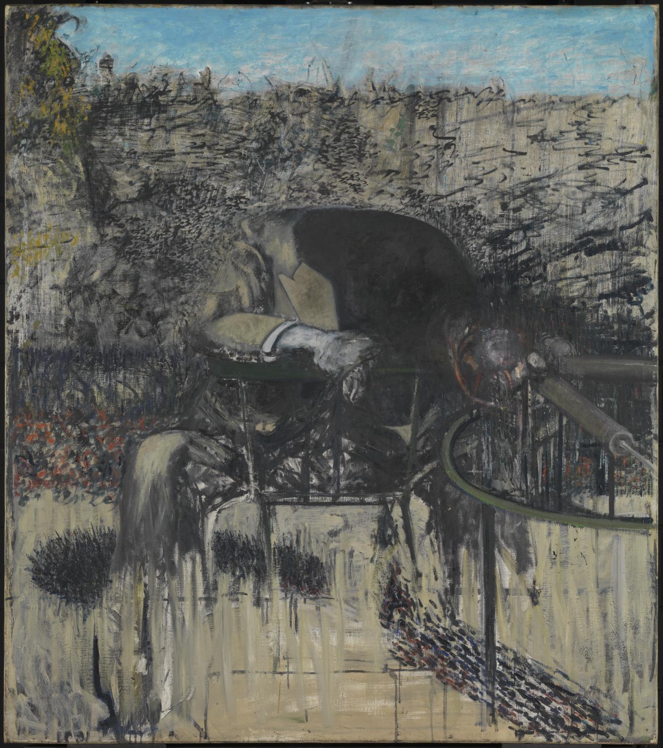 In Tate Modern neem ik plaats op een bankje schuin tegenover Figure in a Landscape (1945) van Francis Bacon. Er komt iemand naast me zitten die me vraagt waar ik naar kijk. ‘Naar dat schilderij’, zeg ik semi-verbaasd, aangezien het bankje niet recht voor het werk staat en hij aan mijn kijkrichting duidelijk zou moeten kunnen aflezen waar ik naar kijk. ‘Nee,’ vervolgt hij, ‘ik bedoel, wat precies op het doek trekt je aandacht?’ Ik mompel iets over ‘lekkende schaduwen’, iets dat me altijd al geboeid heeft aan de doeken van Bacon, hoe de afgebeelde figuren dikwijls gepaard gaan met ectoplasma’s, alsof ze meer dan alleen zichzelf zijn, alsof ze transformeren waar je bij staat, alsof ze meerduidig zijn.