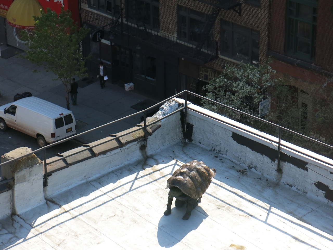 Thwaites is echter geen lone wolf. Het verlangen te willen transformeren in iets niet-menselijks, en daarmee als het ware in het leven te verdwijnen, is iets wat je in de hedendaagse kunst meer ziet gebeuren. De Franse performance kunstenaar Abraham Poincheval verbleef recentelijk een week lang in een twaalf ton zware rots om daarmee naar eigen zeggen ‘de verouderde steen in de rots te voelen’. Eduardo Navarro, een Argentijnse kunstenaar, ontwikkelde voor zijn performance Timeless Alex (2015) een schildpaddencorset waarmee hij een poging waagde om de lichamelijke ervaring van een schildpad na te bootsen. En ten slotte Jae Rhim Lee. De Amerikaanse kunstenares die, op basis van paddenstoelen, een begrafenispak (Infinity burial suit) ontwikkelde dat bijdraagt aan het natuurlijke afbraakproces van begraven lichamen.