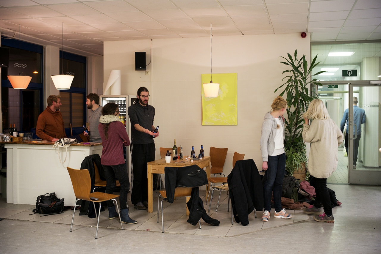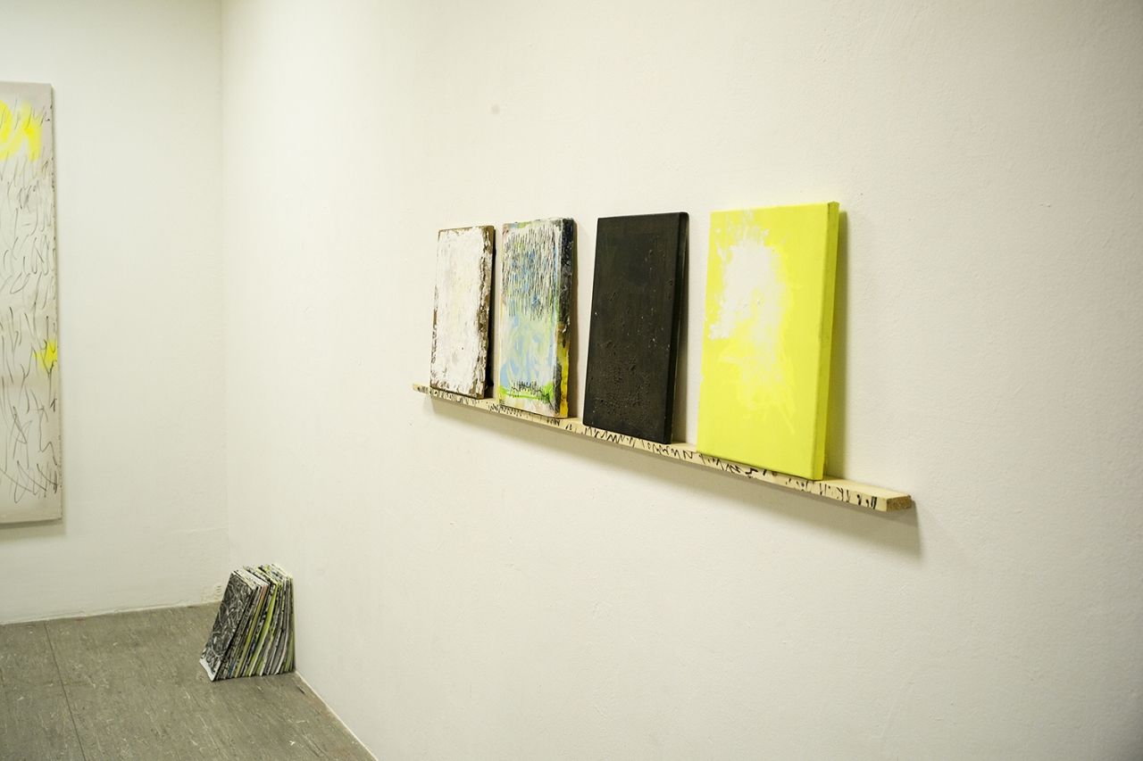 ‘’Don’t stop me now. I’m having such a good time. I’m having a ball. Don’t stop me now.’’ De stemmen van drie jonge jongens schallen door de expositie ruimte. Mensen drinken bier, lopen wat rond en zingen karaoke. Aan de muren hangen gekleurde abstracte schilderijen. Diverse latjes die beschreven zijn met tekst liggen verspreid over de vloer en in de hoek staat een plastic tas van de markt gevuld met stof.