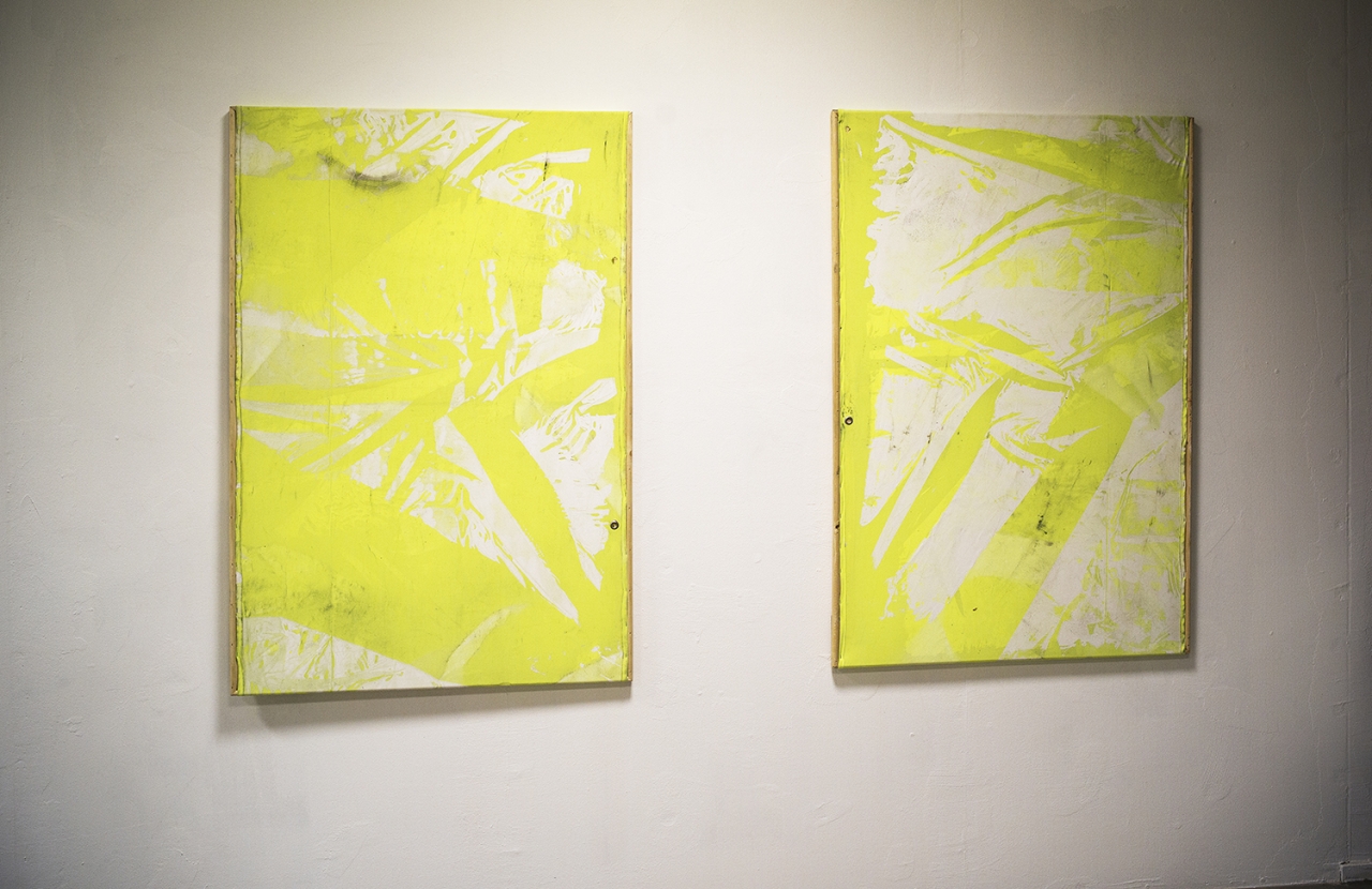 Rechts achter in de hoek van de expositieruimte hangen aan de witte muur twee schilderijen. Geel fel gekleurde doeken met daarop witte vegen. De doeken zijn voormalige vlaggen geweest die hingen aan de slagbomen van een pont. Enthousiast wijst Ide André naar de zwarte vlekken op deze gele ondergrond. Deze vlekken zijn ontstaan toen de stof nog een vlag was en hij eert deze vlekken door ze een prominente rol in het werk te geven. Nadat de vlaggen van de pond werden verwijderd haalde Ide André ze door de pers van de zeefdruk. Hij bewerkte de doeken verder en vertelt dat hierin esthetiek een grote rol speelt. Bij het bewerken van de doeken kijkt hij hoe hij het doek mooier kan maken. De gele doeken zijn gespannen op houten latten en de randen van het hout zijn nog duidelijk zichtbaar. De kunstenaar wil hiermee de handeling van het opspannen naar voren brengen en laten zien dat de doeken later pas zijn opgespannen en eerst een andere functie hebben gekend.