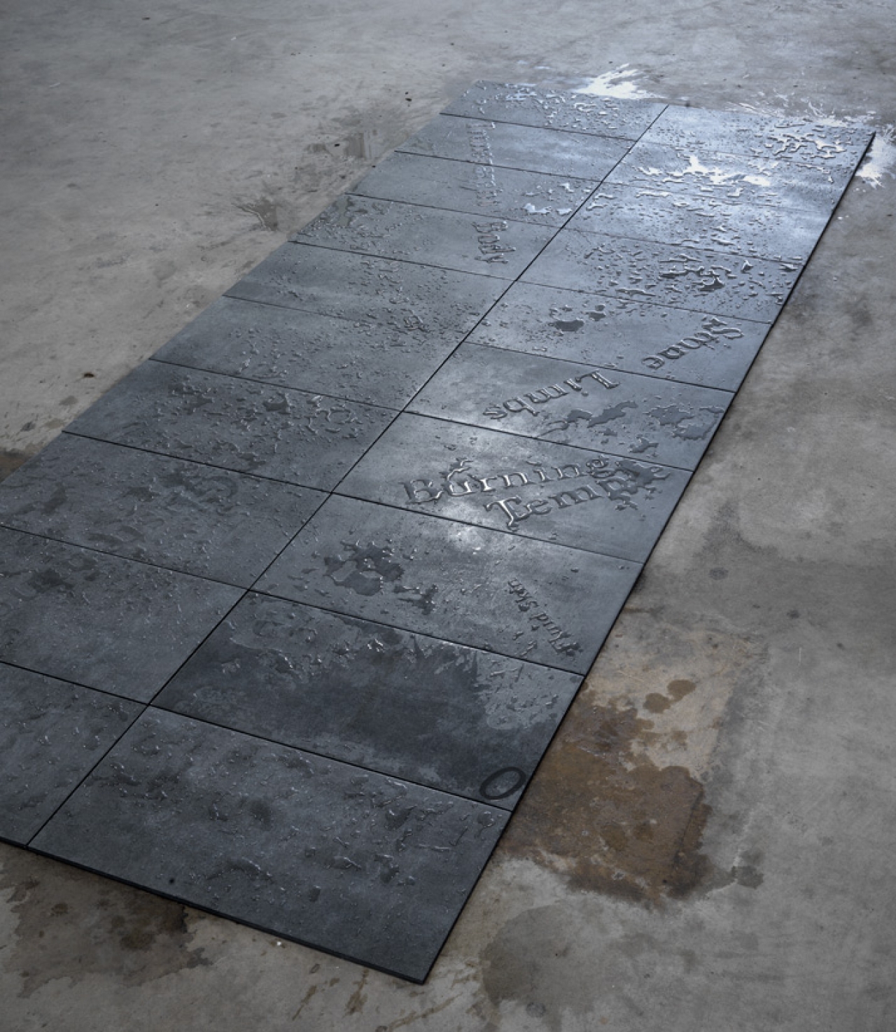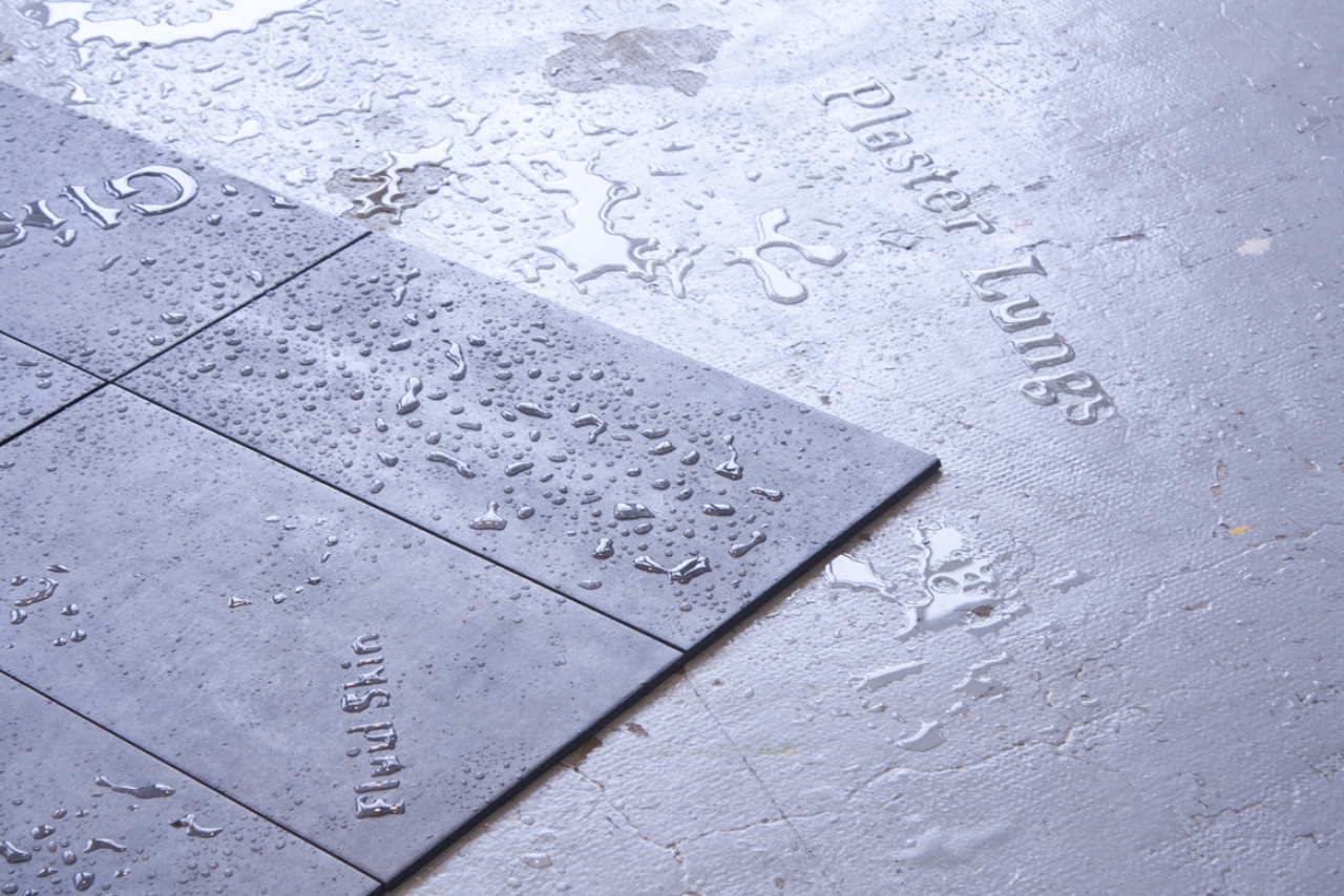 “Een ander mooi voorbeeld is Carl André. Hij is bekend om zijn sculpturen, maar maakt ook gedichten. Hij gebruikt tekst ook als materiaal, letters en woorden lijkt hij in de eerste plaats te gebruiken voor de ruimte die ze op een bladzijde innemen. Ik heb een werk gemaakt dat bestaat uit waterwoorden op keramische tegels die metaal imiteren. Op de tegels staat in tekst een lichaamsdeel en een materiaal, bijvoorbeeld ‘copper mouth’ of ‘stone limbs’. Dat heb ik uit een medisch woordenboek, waarin lichamelijke sensaties met metaforen worden omschreven door patiënten. Het zijn vaak prachtige beschrijvingen. Voor een tentoonstelling heb ik hieruit drie pagina’s genomen waarin het lichaam beschreven wordt als water, lucht, en als grijpend, to grasp, wat ook begrijpen betekent.”