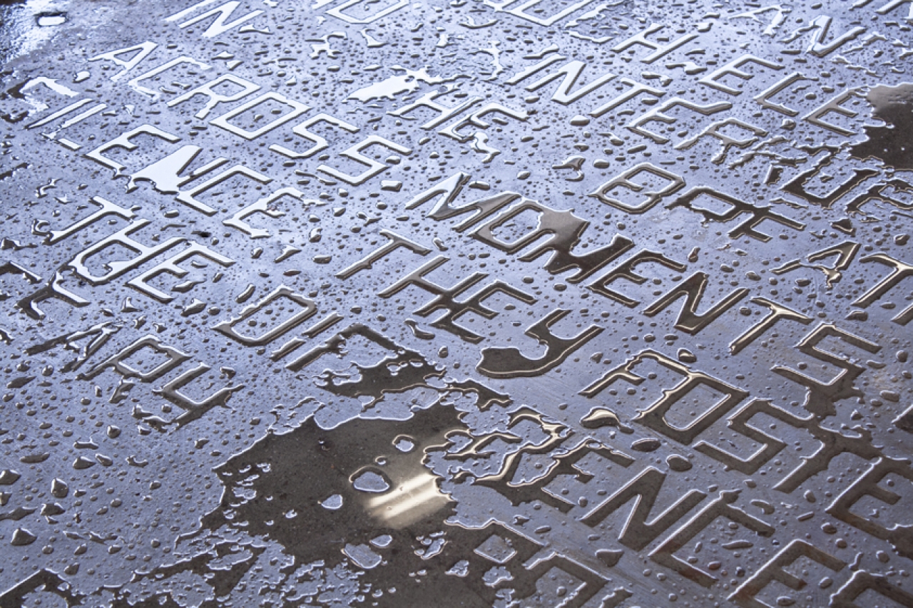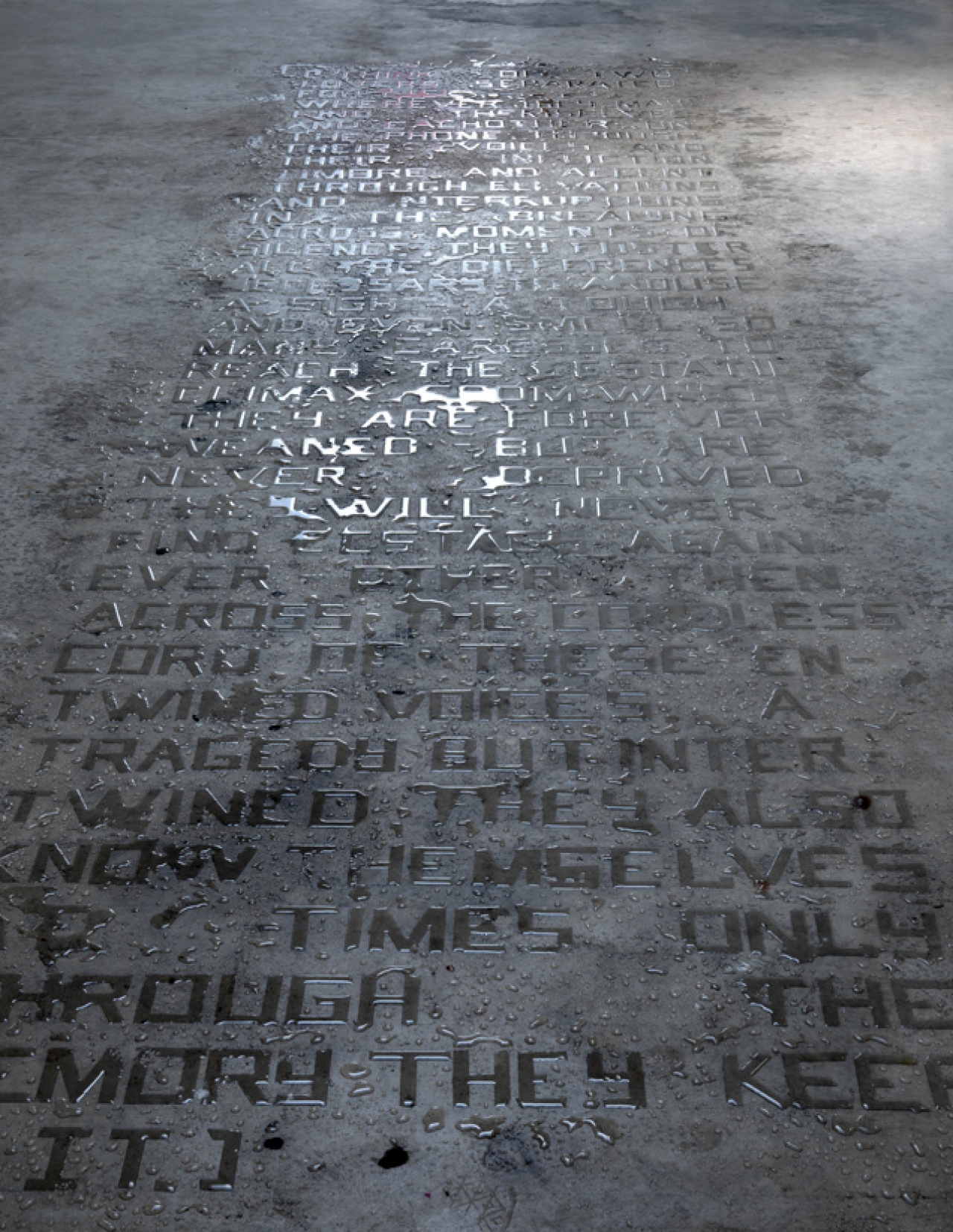 “Bij de één maak ik ruimte tussen de afbeelding en het papier en bij de ander haal ik de woorden van hun dragers en plaats ik ze in de ruimte. Omdat de teksten van water zijn gemaakt verdampen ze en zijn ze dus niet gefixeerd op een ondergrond. Informatie en drager zijn altijd van elkaar gescheiden in mijn werk, ik probeer die twee uit elkaar te trekken, dan is er meer ruimte voor poëzie. Tegelijkertijd is die inwisselbare relatie tussen drager en informatie normaal geworden door digitalisering. Tekst of beeld wordt niet meer gefixeerd, maar neemt slechts tijdelijk geheugenruimte in. Informatie kan vrij gekopieerd, doorgestuurd, verwijderd en vervangen worden, dat was eerder niet het geval.