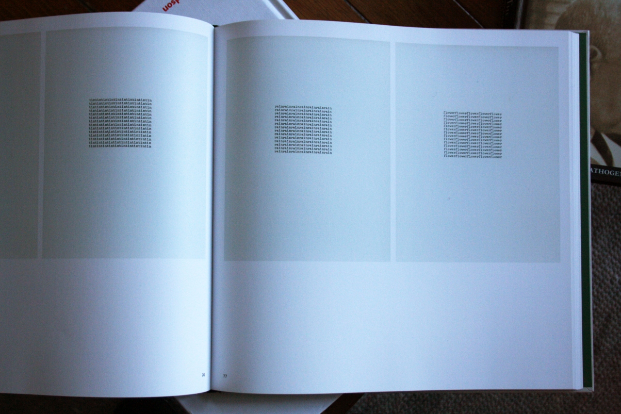 “Dit is een boek dat veel verschillende voorbeelden geeft van Concrete Poetry, een beweging die opkwam in de jaren ’50, en sterk beïnvloedt is door bijvoorbeeld Mallarmé en Apollinaire. Er ontstaat in deze gedichten een nieuw soort poëzie omdat er gebruik gemaakt wordt van de relatie tussen de opmaak van het gedicht en de betekenis van de letters en woorden. Als dit goed gedaan is, verrijkt dat elkaar. Het gaat hier niet meer over het lineaire lezen, het blad wordt een ruimte, een speelplaats voor de woorden. Tekst en de grenzen van leesbaarheid hebben altijd een belangrijke rol gespeeld in mijn werk. Toen ik net van de academie kwam fotografeerde ik al citaten, waarna ik het papier verfrommelde en herfotografeerde.”