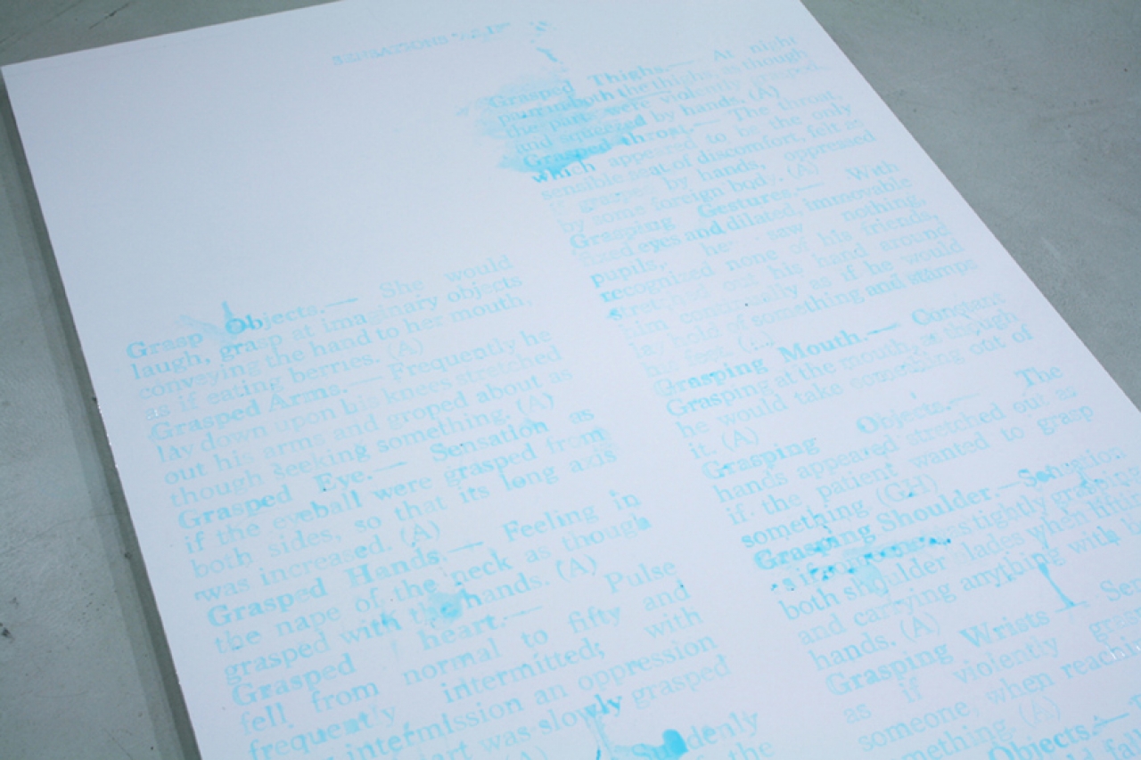 Voor de teksten gebruik ik citaten, maar ook zelfgeschreven stukken, ik maak hierin geen onderscheid. Ik heb bijvoorbeeld een stuk gebruikt van Derrida, terwijl een andere weer in mij op kwam terwijl ik ergens in een bar zat. Deze twee voorbeelden gaan over het problematiseren en uitstellen van aanraking, wat in mijn werk eigenlijk ook gebeurt, tussen tekst of afbeelding en drager.