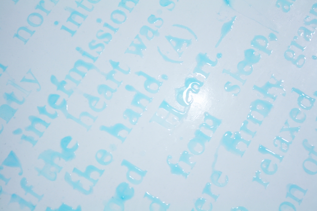 Dit doe ik vaak door een handmatige ‘interventie’ toe te voegen aan gemechaniseerde reproductieprocessen. Ik voeg een fysiek gebaar toe waardoor je bijna door het medium heen moet om de tekst of afbeelding te lezen. Bij mijn waterwoorden moet ik zelf ook heel veel moeite doen voor één tekst. Hierdoor duurt het niet alleen langer voor de kijker om iets te lezen, maar ook ikzelf moet langer stilstaan bij de informatie die ik overdraag.”