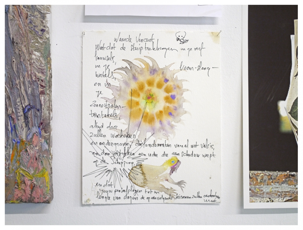 37 kunstenaars reageerde in de tentoonstelling ‘In de ontreddering de kalmte bewaren’ op de laatste nooit verstuurde onvoltooide brief van Vincent van Gogh bedoeld voor zijn broer Theo. De brief ruste in zijn broekzak toen hij zelfmoord pleegde. Van Gogh refereert in zijn onvoltooide brief aan zijn schilderijen die ‘in de ontreddering de kalmte bewaren.’ De brief eindigt met de zinnen: ‘Wel, mijn werk, daarvoor riskeer ik mijn leven, en het heeft me de helft van mijn verstand gekost, […] Maar wat wil je […]’ Hier houdt de brief op.