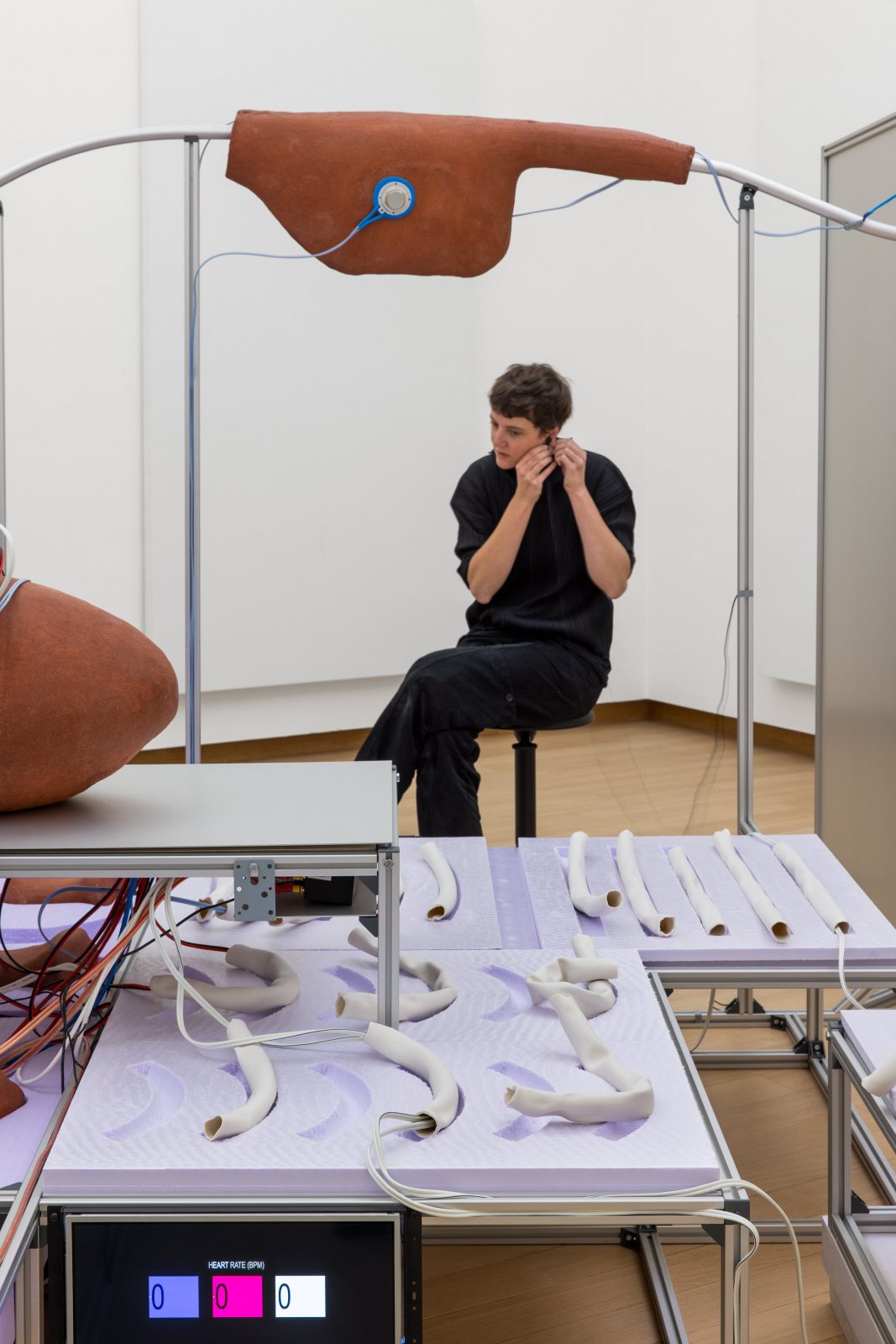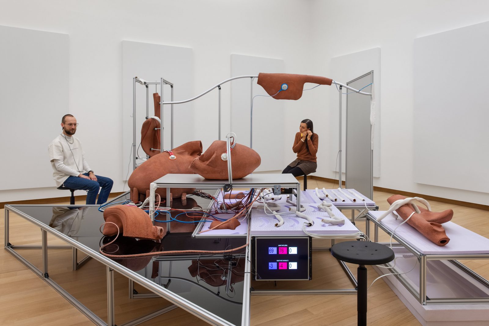 Bij ‘Interpersonal Biofeedback Apparatus Encoding Cardiac Fluctuations’ (2021, Prix de Rome) ontdekte ik dat de hartslagmeters op smartphones heel vaak middelen. Dat is praktisch, anders meten ze te veel ruis uit de omgeving. Dus nemen ze tien hartslagen en daarvan nemen ze het gemiddelde, terwijl ik juist die ontzettende onvoorspelbaarheid van het hart zo fascinerend vind en die kunnen we ook registreren met technologie, dus samen met technicus Kees Reedijk hebben we een installatie gemaakt met hartslagmeters die juist al die complexe variabelen opvangt. Op basis van die data klonken er uit keramische objecten interactieve geluiden die waren gecomponeerd in samenwerking met componist Sjoerd Leijten.