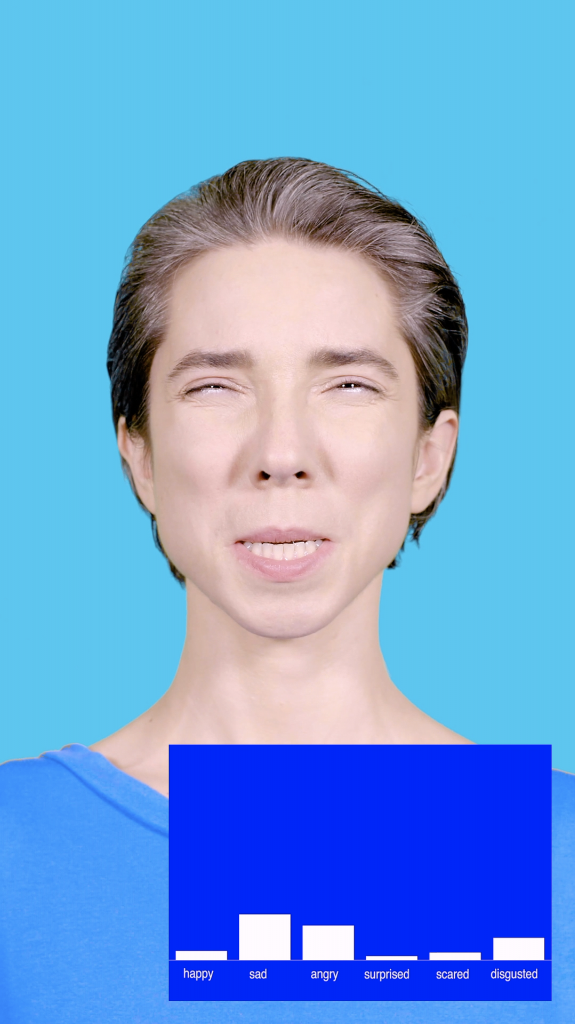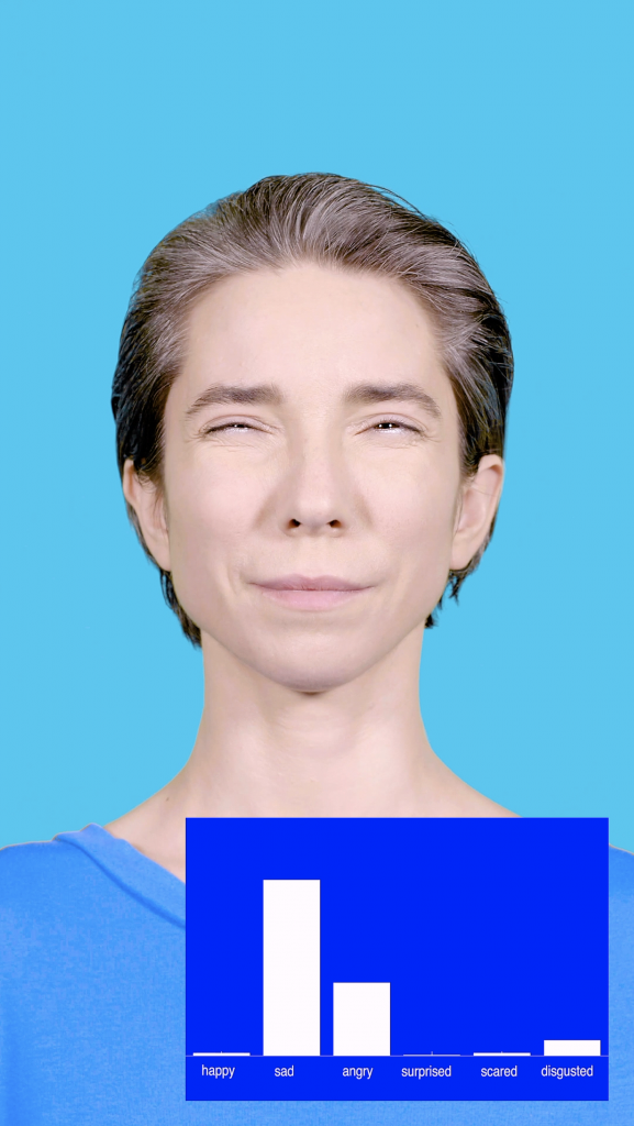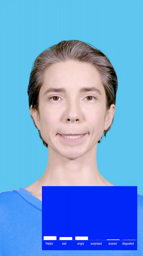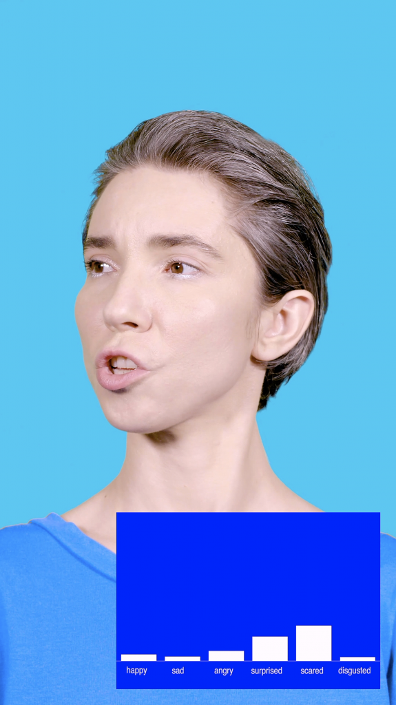 Die wilde ik inderdaad complexer maken door met actrice Marina Miller Dessau te gaan werken en haar random gezichtsspieren te laten gebruiken en aantrekken. Vervolgens keken we naar de manier waarop die software haar spieroefeningen duidde en ook naar welke emoties er opkwamen bij de actrice. Dan stel ik wel vragen als: kunnen we die emotieherkennigsoftware complexer maken dan de zes basisemoties die nu worden herkend?
