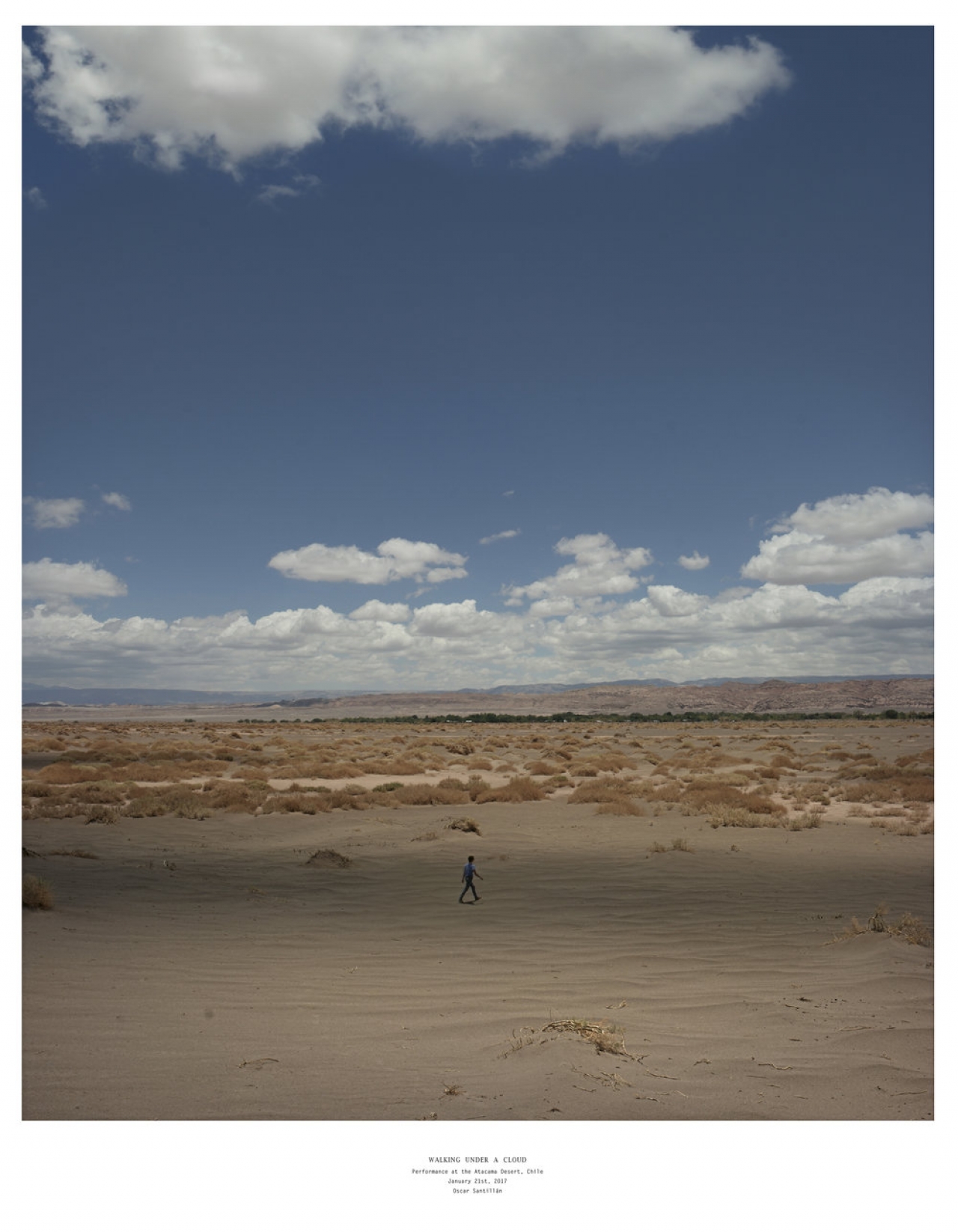 In 2017 valt er een wolkvormige schaduw op het mulle zand van de Atacama woestijn in Chili. Kunstenaar Oscar Santillan wandelt met de vergrijsde vlek mee, en houdt de zwevende wolk verantwoordelijk voor het verloop van de tocht. De wolk waarborgt een onvoorspelbaarheid – waar Santillan zich als mens enkel nederig naar kan opstellen. ‘Walking Under a Cloud’ lijkt te begrijpen wat het niets behelst. Door niet te weten waar de wandeling van Santillan zal eindigen, predikt het werk een gelijktijdige vorming als de verwerping van een definitie. Het brengt ons terug bij nul.