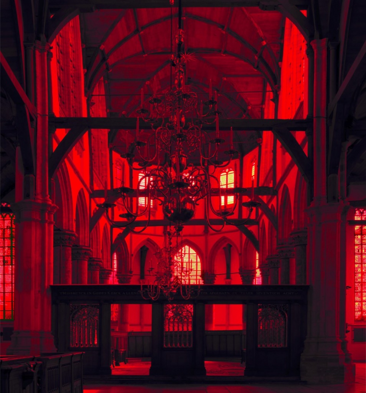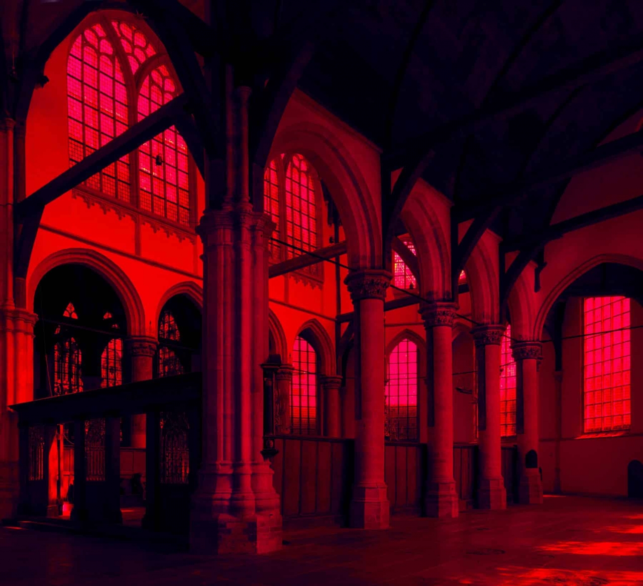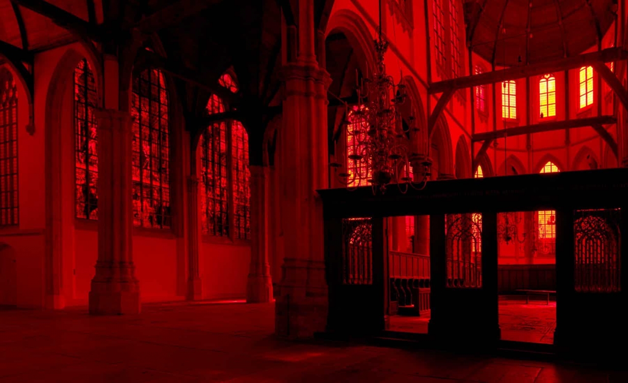 Door een ander type toerist ruikt het er anno 2018 meer naar wiet en wafels. Toch is het verschil tussen het gewemel van mensen en de rust in de kerk nog altijd opvallend en vaak een verademing. Deze zomer is het contrast tussen het binnen en het buiten van de Oude Kerk nog extremer. Wanneer je naar binnen gaat, tref je een plek waar het niet alleen rustig is, maar die ook volledig in rood licht baadt. In het hele Red Light District is geen ruimte te vinden waar het rode licht sterker aanwezig is dan hier (of althans, daar ga ik gemakshalve maar even vanuit zonder daadwerkelijk alle ruimtes te hebben bezocht).