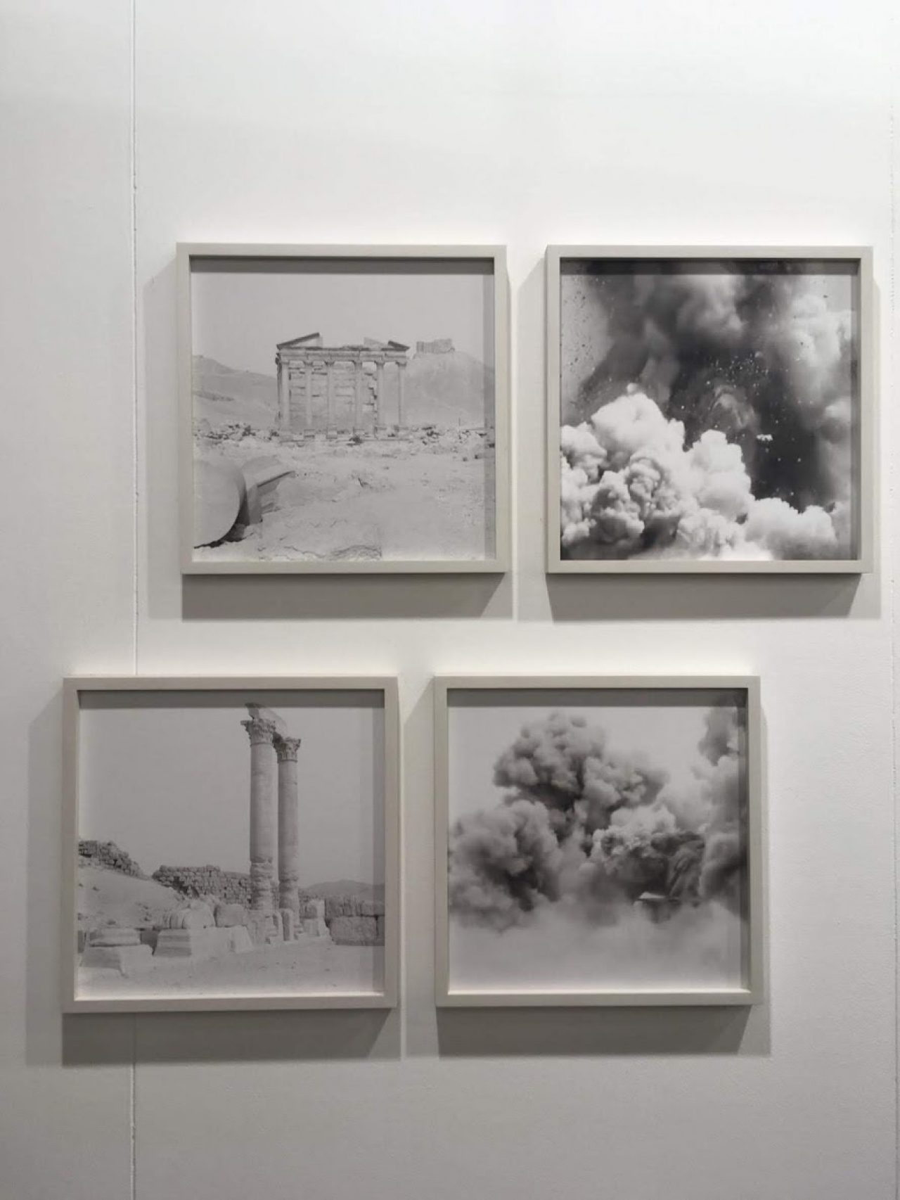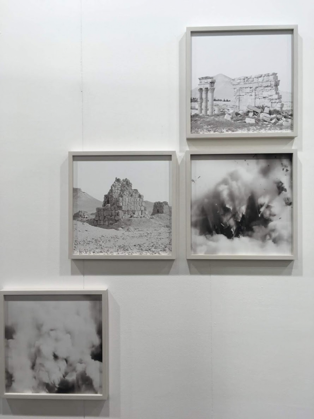 Massimiliano Gatti toont ons zwartwit foto’s van afgebrokkelde ruïnes, monumenten en krachtige ontploffingen. De ruïnes laten sporen uit het verleden achter die vervolgens op de ernaast hangende foto tot ontploffing worden gebracht. Als gevolg: beelden van rookkolommen, stofwolken en vliegende stenen die iets mysterieus hebben. Hij reflecteert hiermee op de relatie tussen historisch geheugen en het heden. De foto’s gemaakt in Palmyra, tijdens de bezetting van het Islamitische leger tonen de verwoeste gevolgen van die bezetting. Daarnaast zien we videoframes van ISIS-propaganda video’s waarin zij vernielingen van archeologische gebouwen documenteren. De rookwolken lijken zo in eerste instantie wellicht alleen esthetisch mooi maar dragen meer met zich mee.