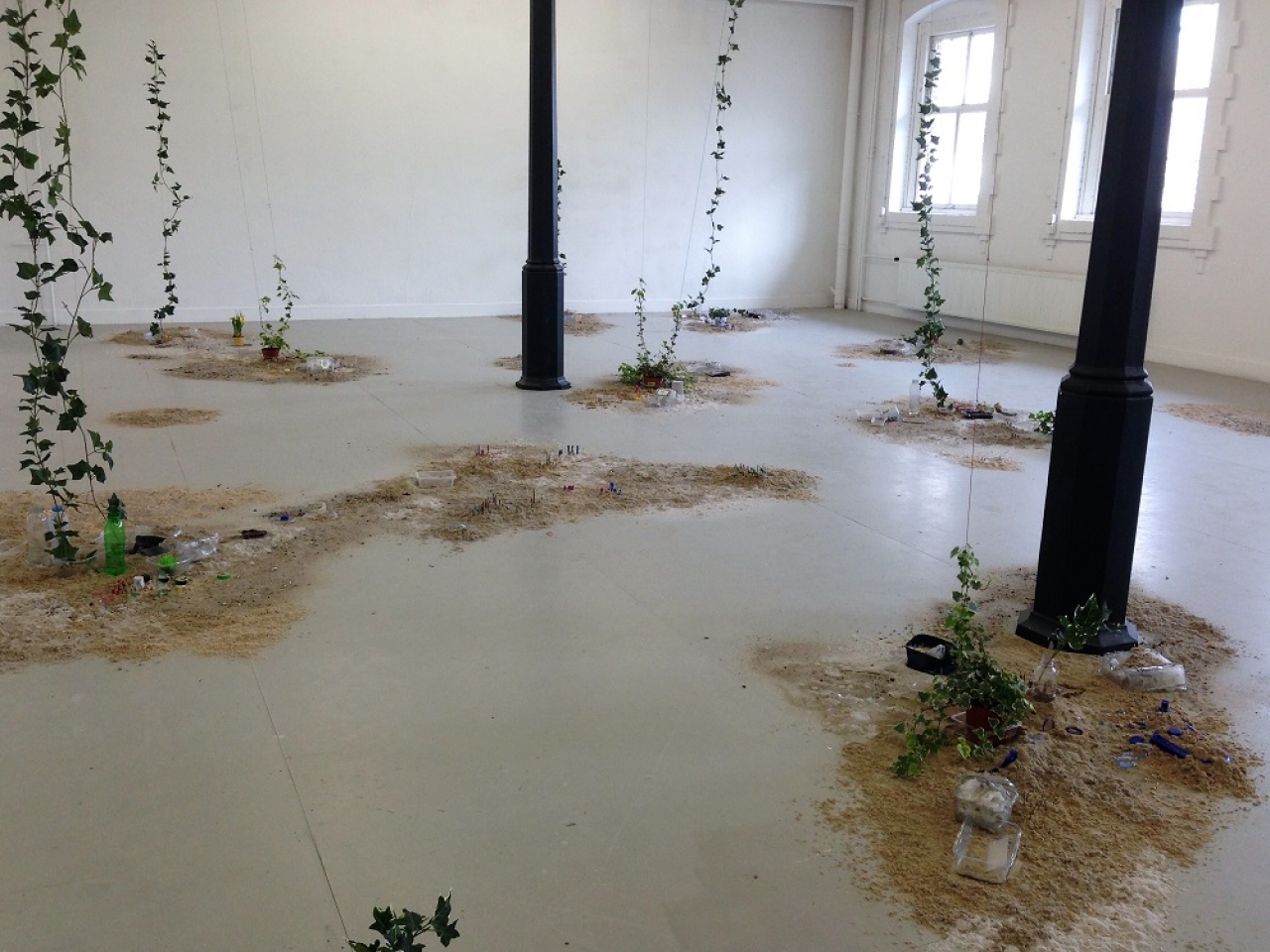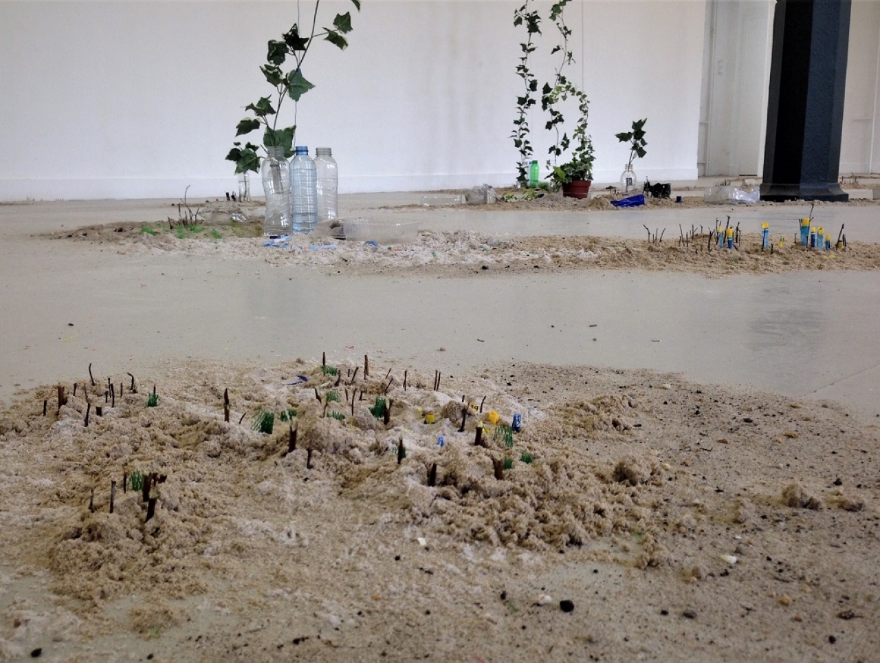 De installatie beneden vormt een parallel met de installatie in de bovenzaal waar tevens een landschap is gepresenteerd. Dit werk, genaamd ‘View on the Shore’ (2018), toont wederom verschillende eilanden in de ruimte maar ditmaal bestaan deze uit verschillende kleuren zand waarop planten en transparante plastic voorwerpen liggen zoals flesjes, containers en doppen. In het zand zijn patronen aangebracht en de voorwerpen hebben een zekere ordening.