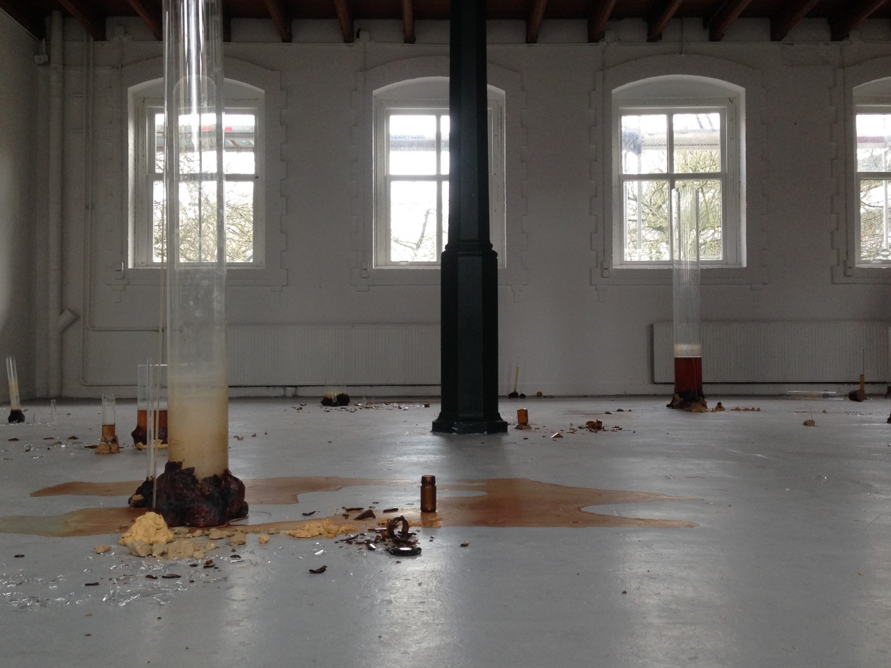 De installatie draagt geen titel en bestaat hoofdzakelijk uit grote glazen reageerbuizen gevuld met verschillende soorten thee. Met klei zijn de buizen aan de onderkant dichtgemaakt en bevestigd aan de grond. Veel van de buizen lekken door de klei heen of liggen helemaal in stukken op de grond waardoor vlekken van opgedroogde thee op de vloer zijn verschenen.