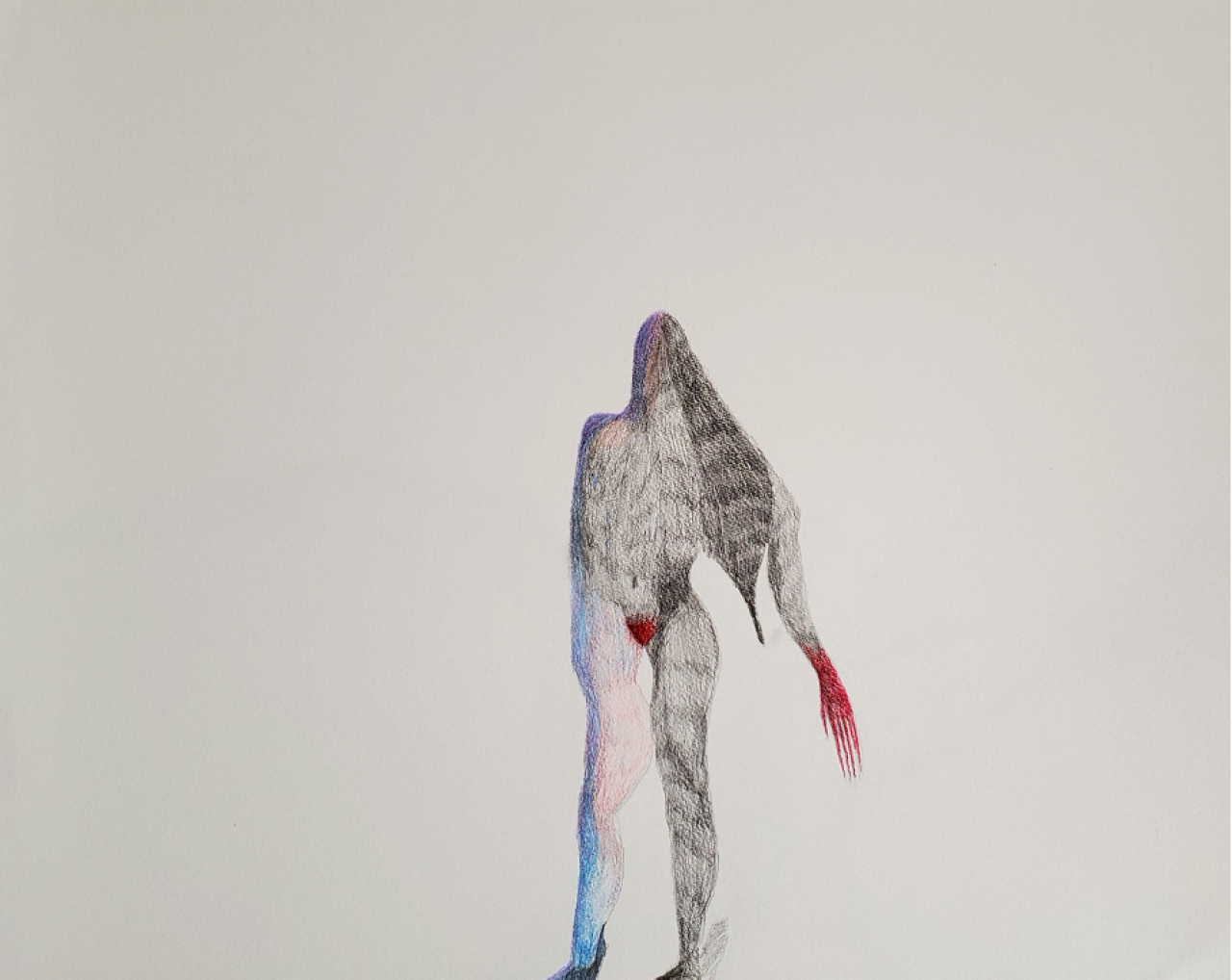 Van de donkere ruimtes loop ik richting een lichtere ruimte en even knipper ik bij het zien van Selma Selmans tekeningen Superpositional Intersectionalism (2020). In de werken die ik tot dan toe heb gezien vormen fysieke en existentiële staten (van geweld) een zekere rode draad. Hier is dit fysieke aspect expressionistisch en even helemaal weg uit de realiteit. Selmans woorden vertellen: ‘’I do not accept that the only possible ethical visual response to these spectrums of events is to produce another image of a man, a suffering victim, or an implied trace of violence’’. Een tiental kleurrijk getekende gestalten rekken zich met onmenselijk uitgerekte armen, eenogige gezichten en de figuren lijken zich in verschillende staten te bevinden. Ze oppert om onderliggende mechanismen die de genocide hebben veroorzaakt te ontmantelen. In plaats van het geweld te representeren word je als kijker uitgenodigd om je te verplaatsen in diverse gevoelswerelden die deze genocide heeft veroorzaakt. Ondanks de mooie, kleurrijke en bijna vrolijke tekeningen bekruipt mij het benauwde gevoel dat het onderdrukte emoties zijn die misschien alleen tot uitdrukking kunnen komen in niet reële werelden.
