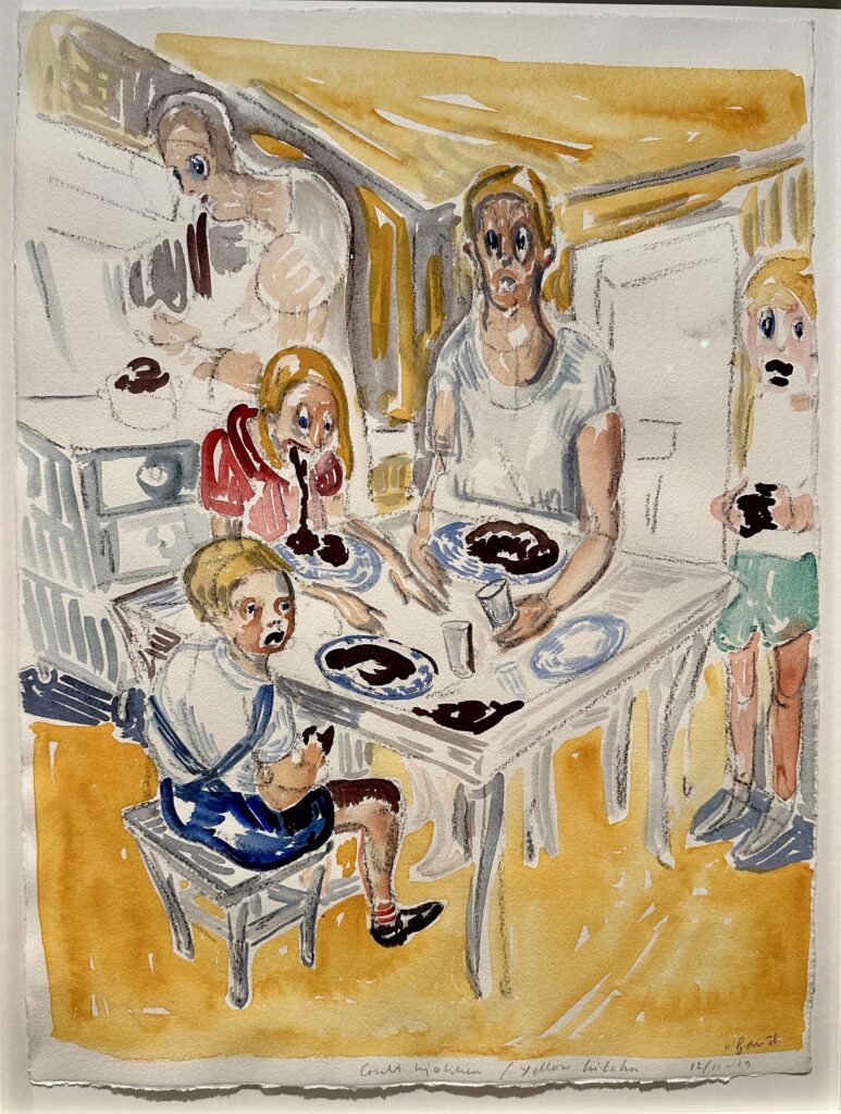 Deze zomer rapporteren onze schrijvers over de werken die ze op vakantie tegenkomen. In Museum De Reede in Antwerpen raakte Hanne Hagenaars begeesterd door de rumoerige tekeningen van Vanessa Baird die ze maakt te midden van een huishouden dat veel van haar vraagt. ‘Aan tafel met een stel kinderen, een gezin. Dat lijkt allemaal heel gezellig maar de een kotst de bruine smurrie weer uit, de ander klapt ermee tussen z’n handen en de derde doet Niets.’