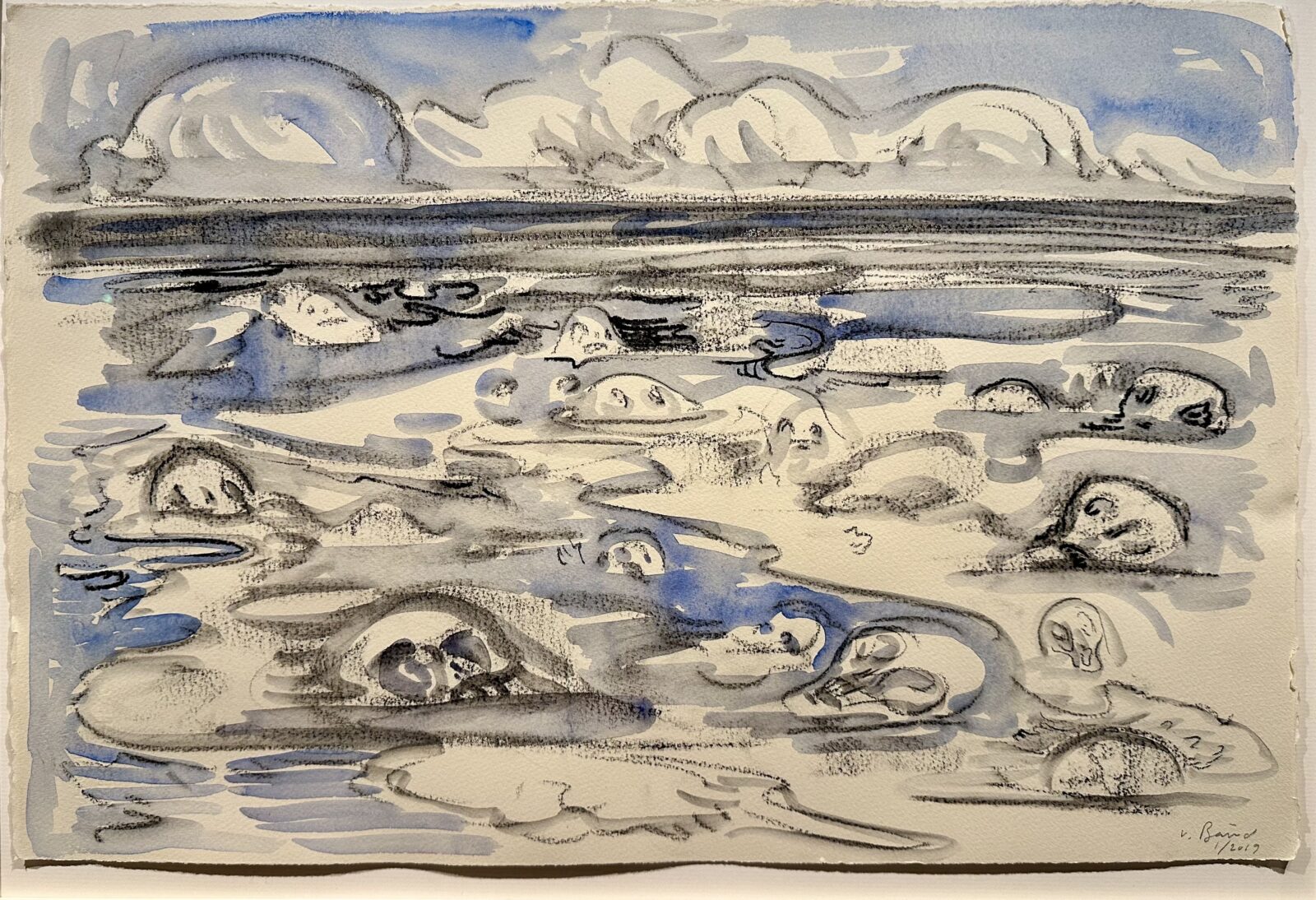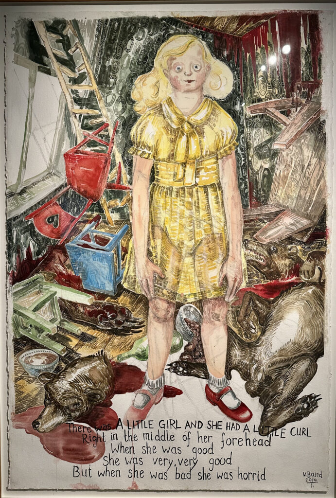 Een vriend voorziet haar van grappen, die Baird in haar tekeningen verwerkt. ‘Roses are red, violents are blue God made me pretty, what happened to you.’ Er hangt ook een rustige tekening van een kalme zee, waar tussen de golven de hoofden van vluchtelingen te herkennen zijn.