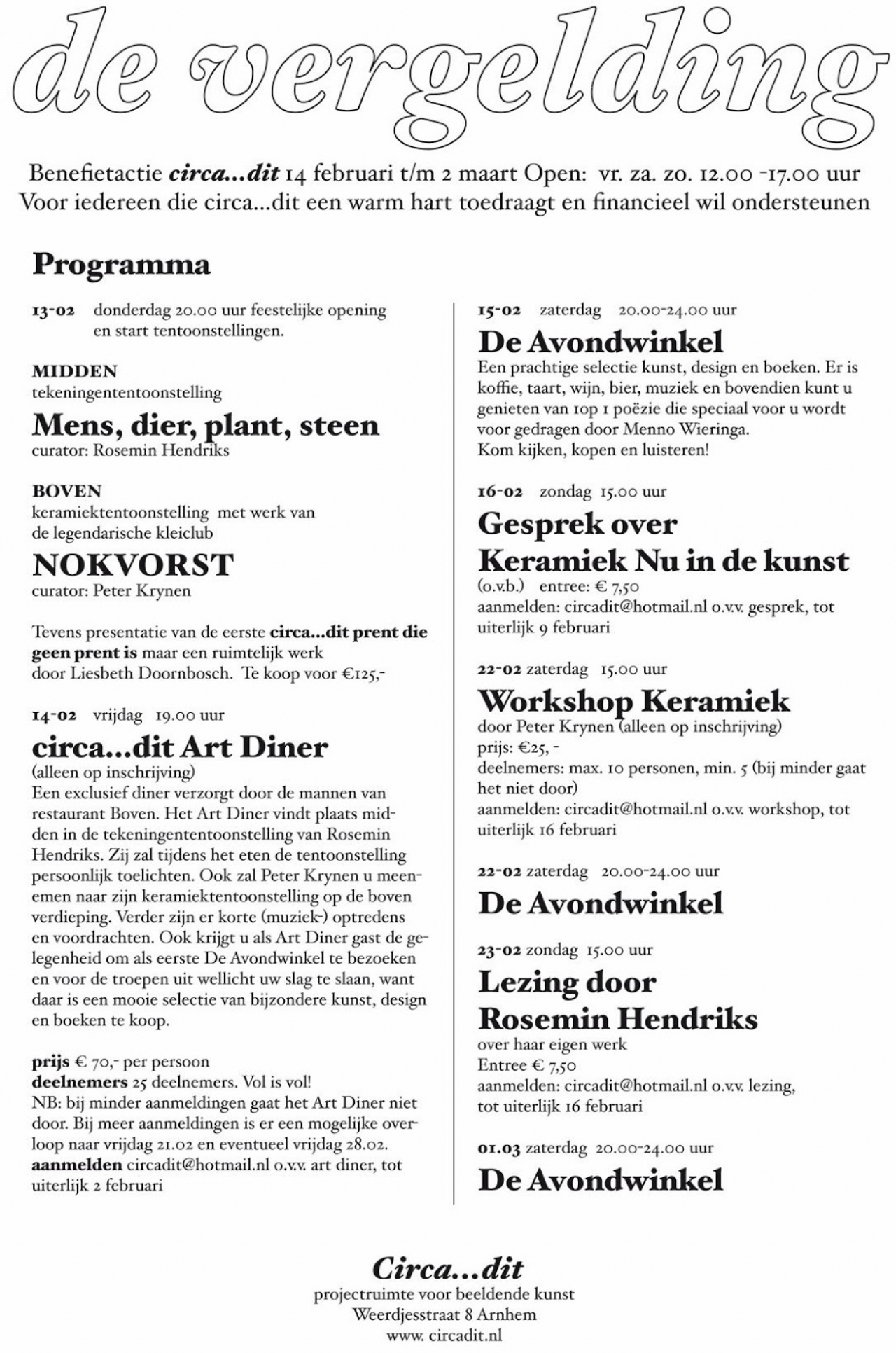 Donderdag 13.02 vindt om 20.00 uur de opening plaats van het benefiet ‘De Vergelding’ in Circa…dit te Arnhem. Naast activiteiten als het Circa…dit Art Diner , een workshop keramiek door Peter Krynen (22.02) en een lezing door Rosemin Hendriks (23.02) bestaat het programma natuurlijk en vooral uit een drietal bijzondere tentoonstellingen.