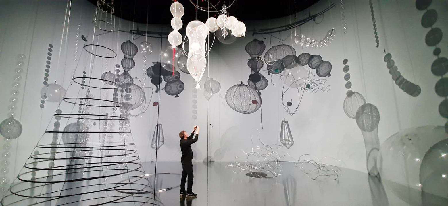 ‘Als ik wist dat Onafhankelijk Toneel daar speelde, ging ik er ‘s ochtend om tien uur al heen. Dan stond Gerrit Timmers daar de voorstelling op te bouwen en dan hielp ik mee. Het ging erom dat het altijd nog moest worden gemaakt en dat er steeds iets kon veranderen. Tegelijkertijd is decorontwerp ook een vak. Ik heb ook voor de Nederlandse Opera gewerkt en in die discipline ga je soms uit van wellustige ideeën, waarbij de vraag is hoe ver je kunt gaan. Daar bouwen ze gewoon een schaalmodel van tien meter waarvoor geschilderd, gelast en gesmeed moet worden. Dat is een ambachtelijke manier van werken, terwijl ik eerder een denkproces in het toneelbeeld waarneembaar wil maken. In 2002 maakte Gerardjan Rijnders met Toneelgroep Amsterdam de voorstelling Snaren over de snaartheorie in de natuurkunde. Daar wist ik niets van af. Ik had zo’n twintig tot vijfentwintig ideeën in mijn hoofd en om te testen welk idee relevant was vroeg ik aan Gerardjan of ik kon bepalen wanneer ik welk idee in de tekst kon integreren. Dat gebeurde. Snaren gaf mij een nieuwe ingang. Namelijk dat een toneelbeeld ook een verzameling kon zijn van ideeën, statements en metaforen. De voorstelling begon met een leeg toneel, een zwart gat. Het was doodstil in de schouwburg. Er was nog niets gebeurd. Dat hield net iets te lang aan. Toen zakte er een houten bordje in de toneelopening. Daarop stond: NIETS. Na een tijd viel de N van het woord af. In een notendop was dat de handleiding om de voorstelling te bekijken.’