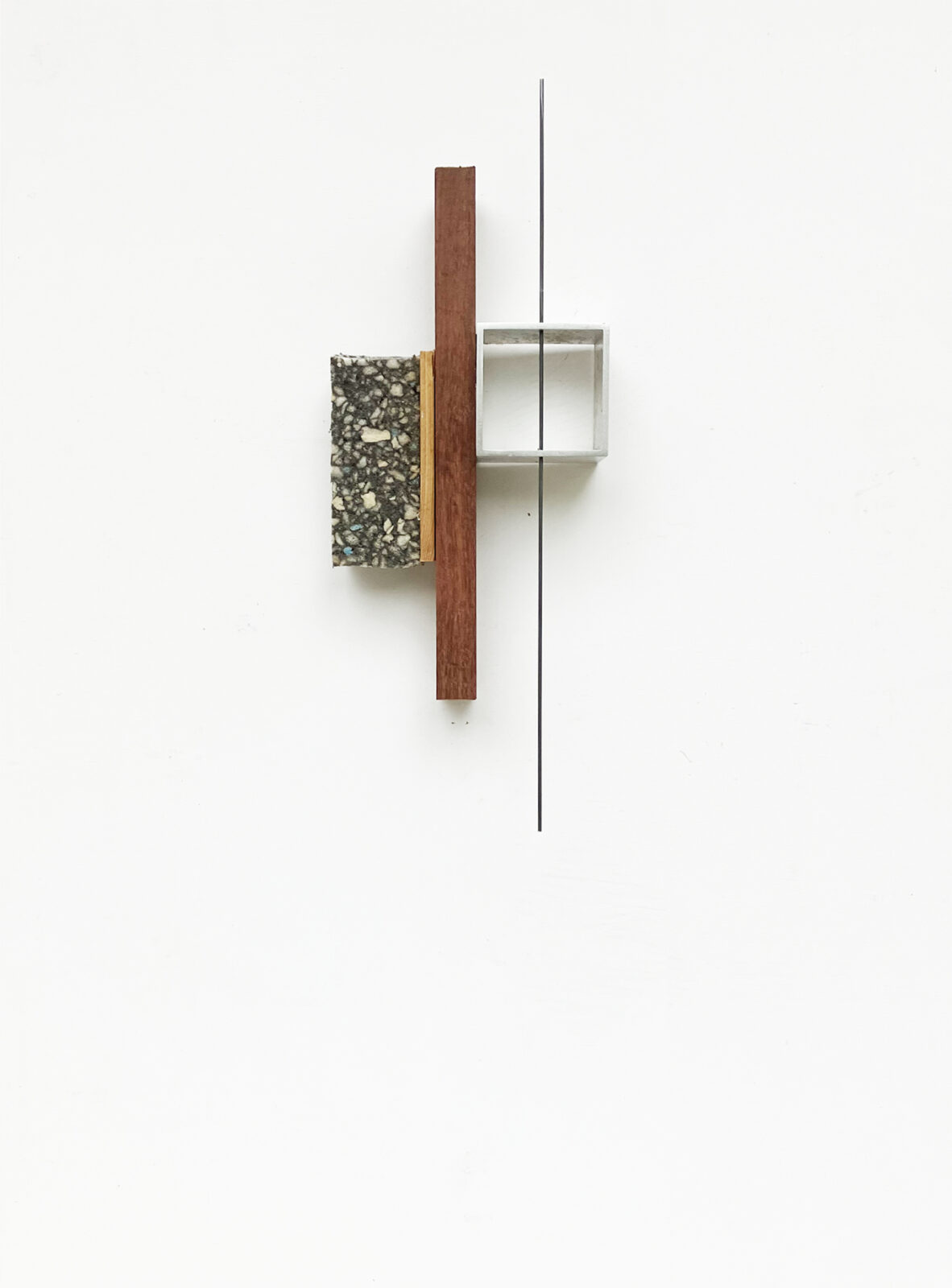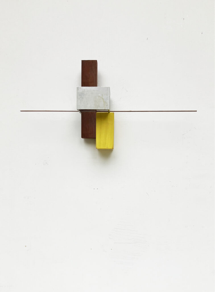 ‘Sinds ik in Groningen woon, werk ik niet meer in opdracht, maar ben ik vrij werk gaan maken. Daarbij gaat het erom dat ik de beperkingen die ik mezelf opleg loslaat door voortdurend een andere oplossing te zoeken. Nu zijn het nog werken aan de wand, maar ik probeer ze vrijstaand te maken. Het beeld moet op zichzelf staan, al is het ergens aan ontleend. Het is in beweging. De objecten met gele en bruine houtblokjes die ik heb gemaakt zijn ontstaan vanuit het huis waar ik nu woon. Ik heb de blokjes hout hier gevonden en er een verstandhouding mee gezocht. Het is een waardevol gevoel dat ik niet stilsta, maar iets ontwikkel met wat ik ter plekke aantref. Ik zoek een ander perspectief binnen het bestaande. Ik maak wel iets dat er eerst niet was. Dat is een verschil met decorontwerp, wat een afgerond proces betreft dat kan worden gearchiveerd. Ik verbind me nu steeds met het volgende wat ik nog ga maken. Ik maak mijn eigen denkproces waarneembaar. Een decor begint met een leeg toneel en eindigt met een ingevuld toneel. Mijn vrije werk ontstaat uit een gedachtestroom die voortbeweegt. In mijn hoofd weet ik welke stappen ik ga maken.’