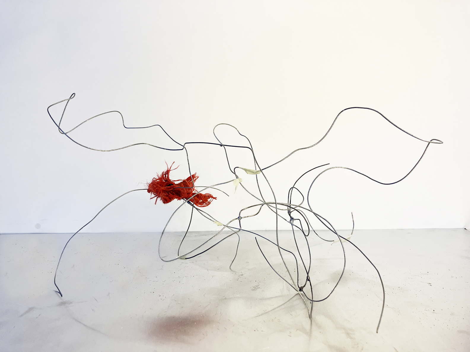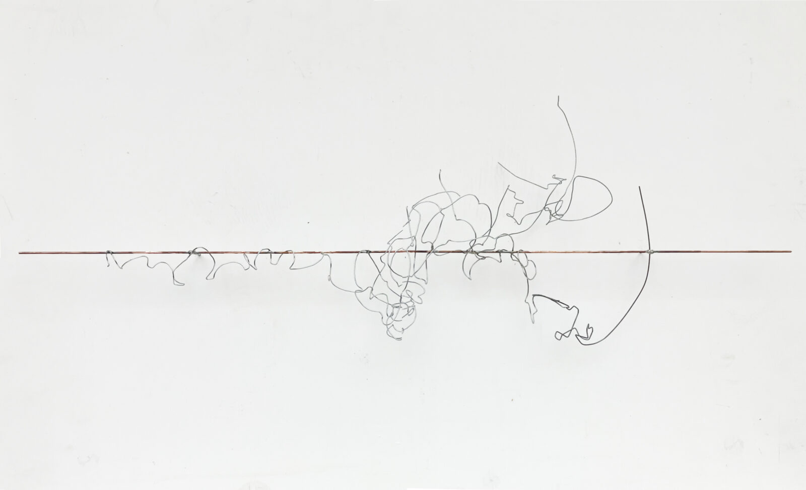 Marc Warning maakt zijn vrije beelden sinds 2021 in de voormalige werkruimte van Kris Bulder en maakt nog deels gebruik van het meubilair van de architect. Zijn sculpturale wandobjecten ontstaan als een tekening die hij op gevoel maakt. Hij tast het papier af met een potlood en met zijn ogen dicht in handmatige gebaren, een vorm van dessin automatique. De tekeningen zijn het uitgangspunt voor objecten van dun ijzerdraad die hij met de hand vormt als een ruimtelijke voorstelling van dat schrift. Het dunne ijzerdraad kronkelt in allerlei richtingen rondom een horizontale as van een dun staafje dat zich als een dunne horizonlijn uitstrekt. De sculpturen hebben daardoor een landschappelijk karakter, maar ze doen zich vooral heel lichamelijk voor. Je ziet een zenuwstelsel of aderen die meanderend door een netwerk een weg naar het hart zoeken. Als we zijn werk in Genootschap Pictura bekijken, komen zijn draadsculpturen over als een driedimensionale vorm van een ongekend brailleschrift. Ik voel ze doordringen tot in mijn haarvaten.